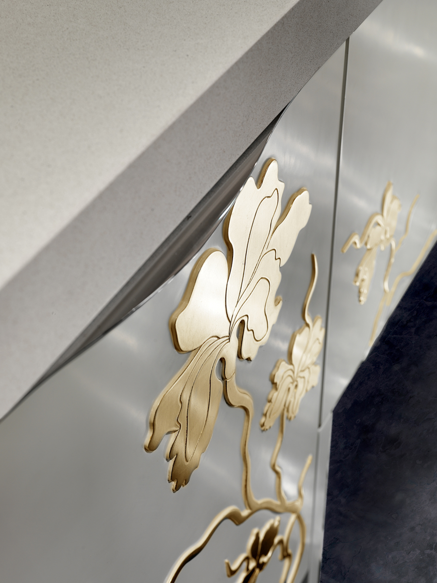 Un decoro raffinato e artistico proposto in versione “Ton sur ton” per un effetto elegante e sobrio, in versione in foglia oro e argento per un contrasto più deciso.
