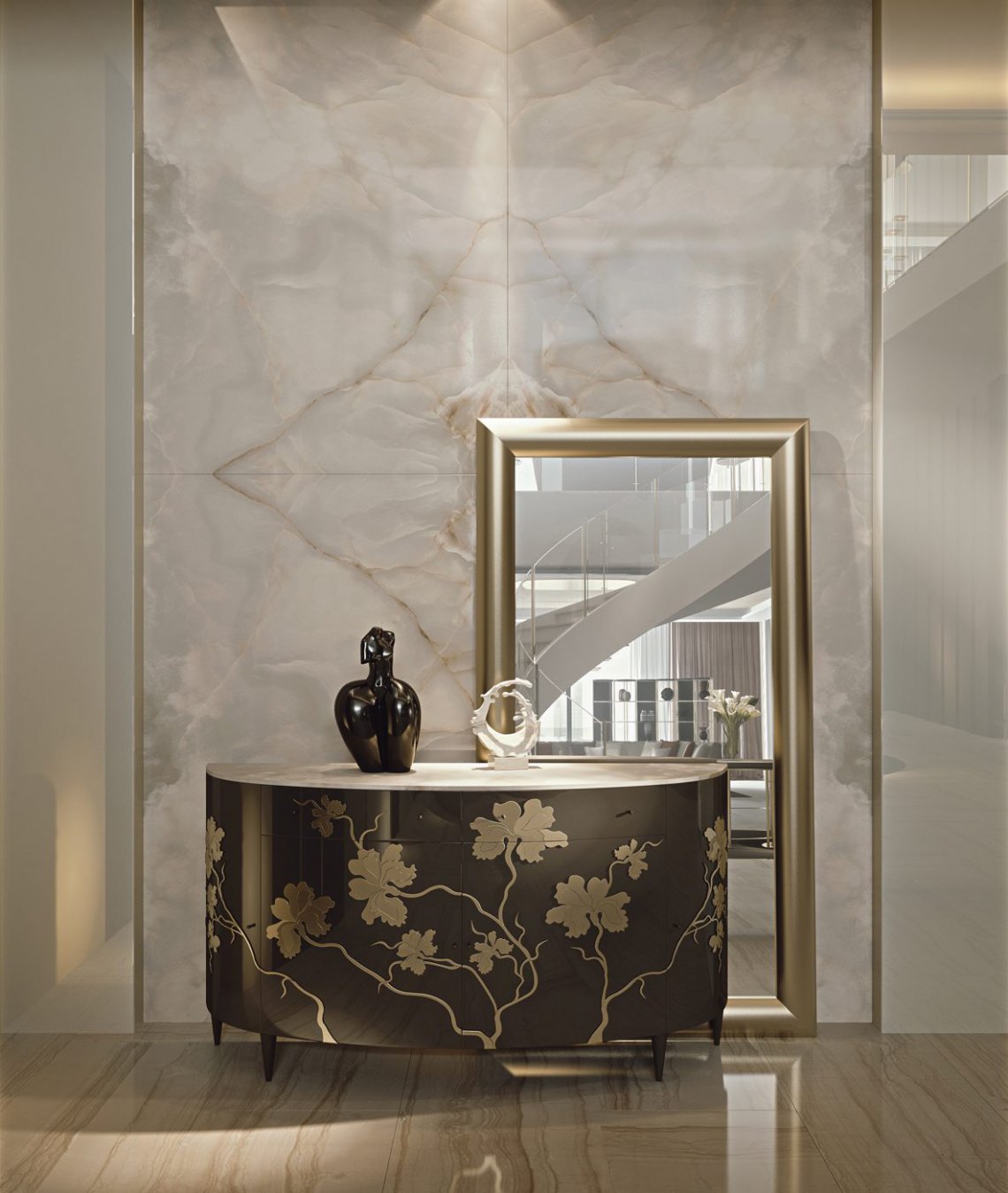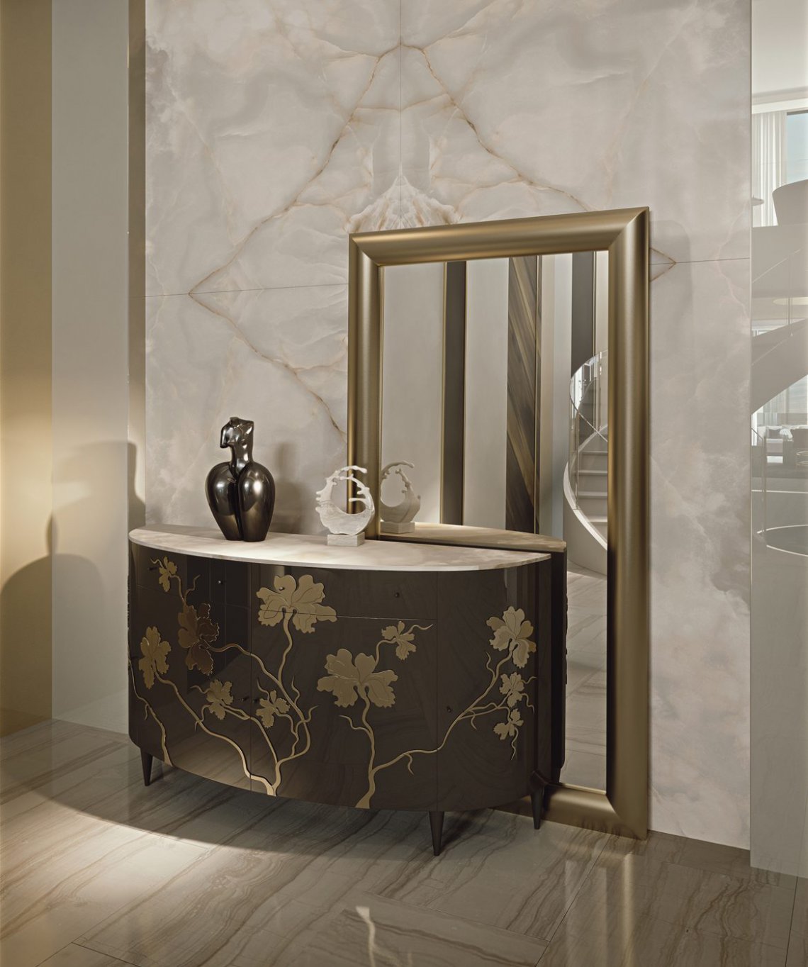 Un decoro raffinato e artistico proposto in versione “Ton sur ton” per un effetto elegante e sobrio, in versione in foglia oro e argento per un contrasto più deciso.