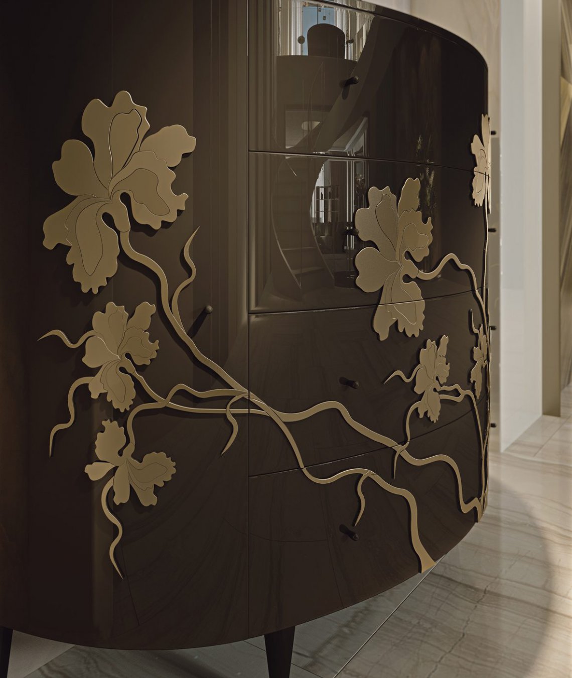 Una collezione ispirata alla delicatezza di un fiore senza tempo. Un ramage fantasioso realizzato a rilievo per impreziosire le superfici di mobili e boiserie.