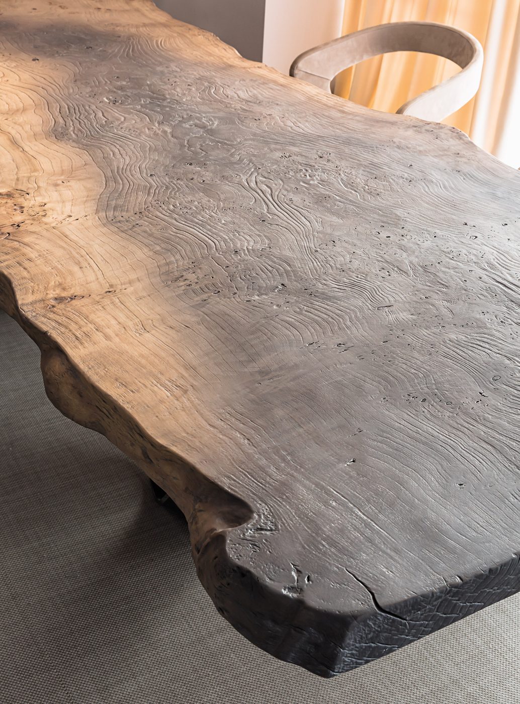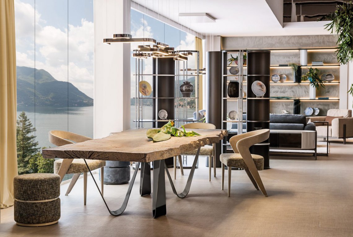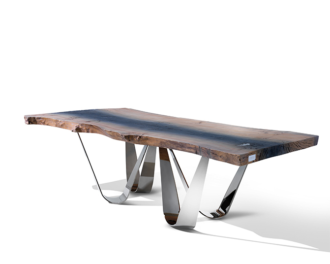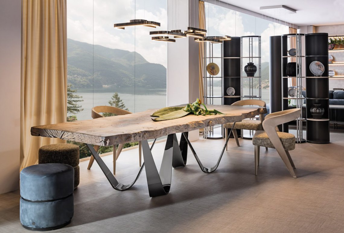 Una collezione che nasce dalla potenza della natura e si manifesta dall’incontro di elementi opposti come la terra e l’aria: l’imponente piano in radica si abbina ad un basamento in metallo chrome black, elemento aereo che suggerisce una sensazione di leggerezza.