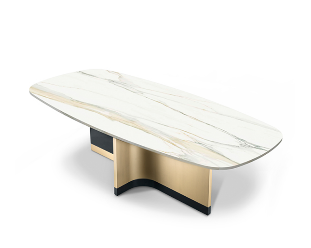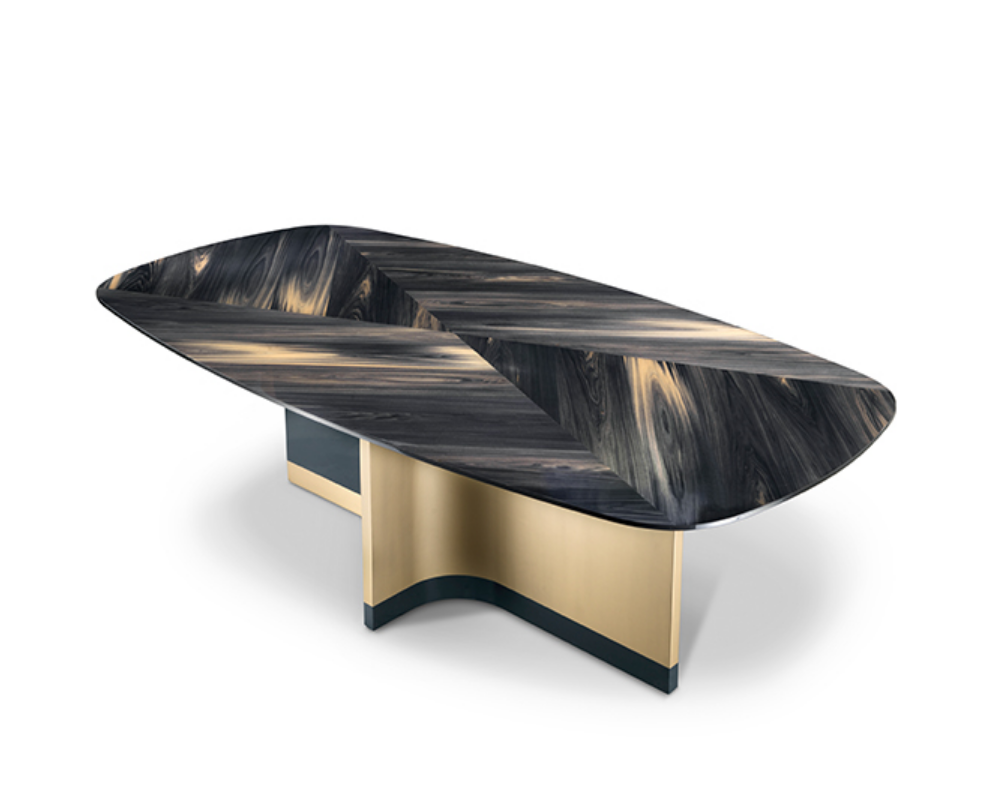 Le superfici possono essere così personalizzate con venature a vista dall’effetto fiammato, per una resa pittorica in contrasto con le forme simmetriche della collezione.