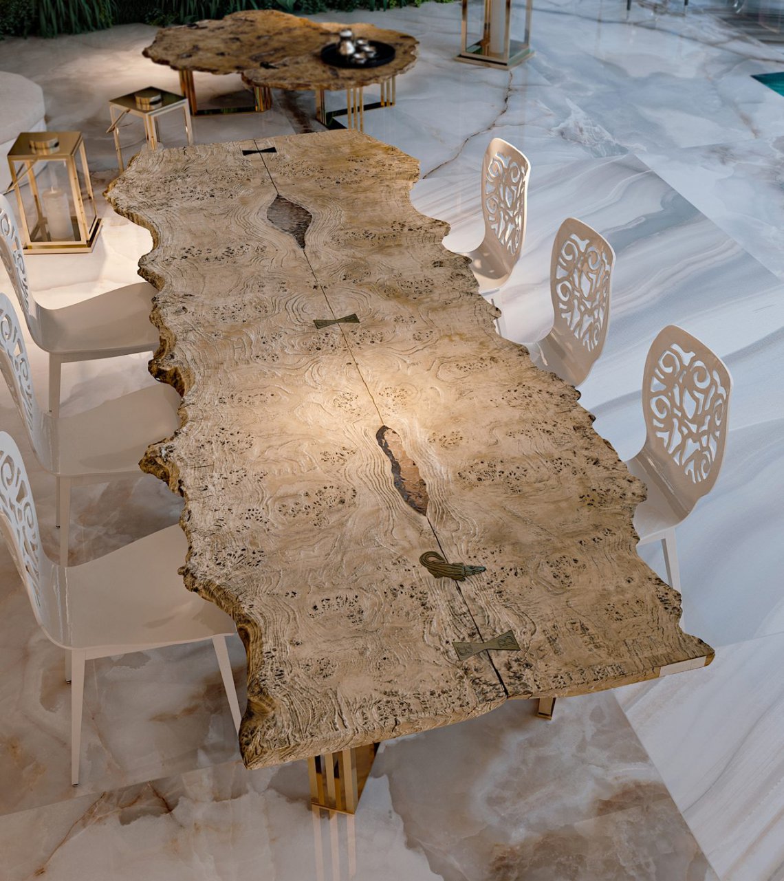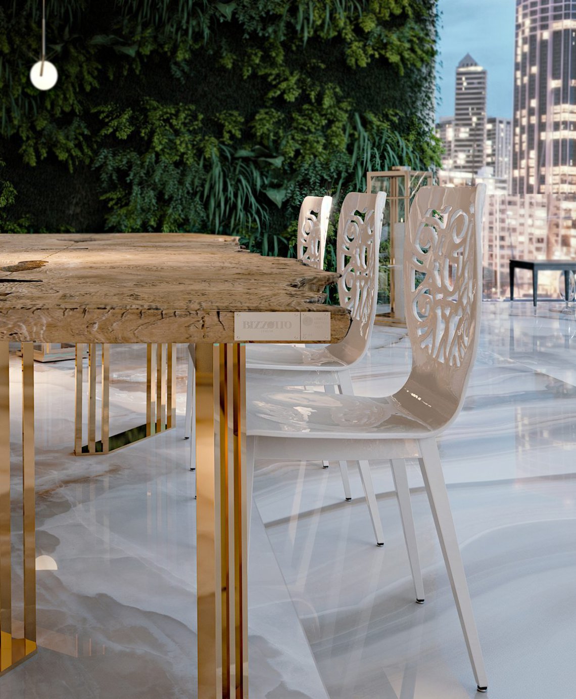 La preziosità degli arredi é accentuata dai riflessi dell’acciaio e dell’oro delle strutture, in perfetta sintonia con gli inserti dell’elegante “Rosa” del marchio Bizzotto Italia elegante dettaglio stilistico senza tempo.