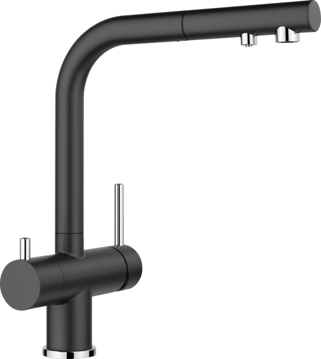 Comfortable 3-in-1-mixer tap with cold and warm water lever on the right, filtered water lever on the left