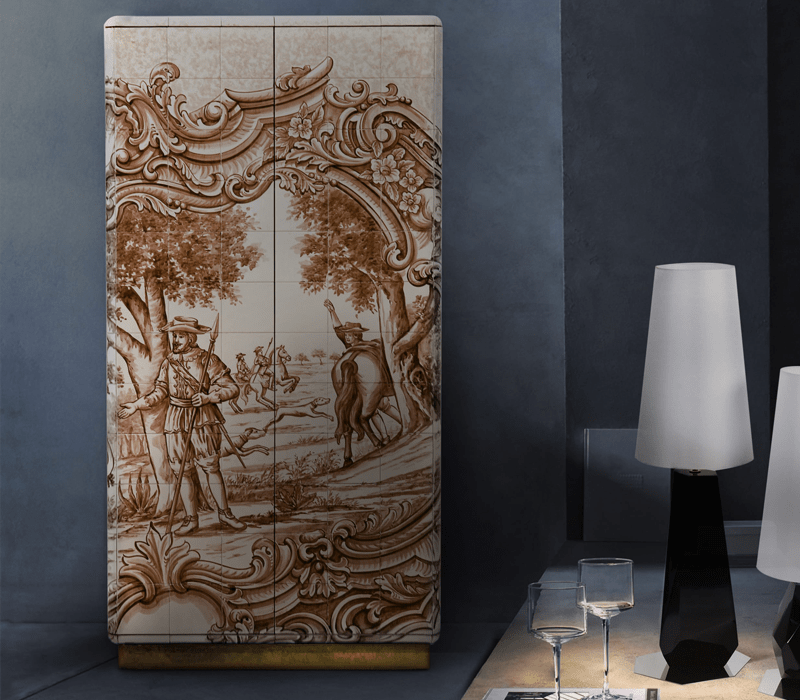 The Heritage Cabinet is a magnificent journey through Portuguese legacy. Covered in Azulejos, traditional hand painted tiles and one of the most representative art forms of Portuguese culture, the architectural cabinet portrays different scenes from the country’s Discoveries era. Centuries of history are gathered in a single final white and sepia panel, and each layer is enhanced by vertical mirrors on the lateral surfaces. The hint of wander through the rich legacy continues when two door open to a lined glossy gold leaf interior, and a classical ornament trim reminds the inside of churches and rich buildings. A clear glass shelve can be seen on the two individual divisions of the cabinet. A statement cabinet, the Heritage can take center stage in the most elegant rooms since its back is also fully hand painted. A lengthy tradition of bespoke and exclusivity to make one-of-kind design pieces.