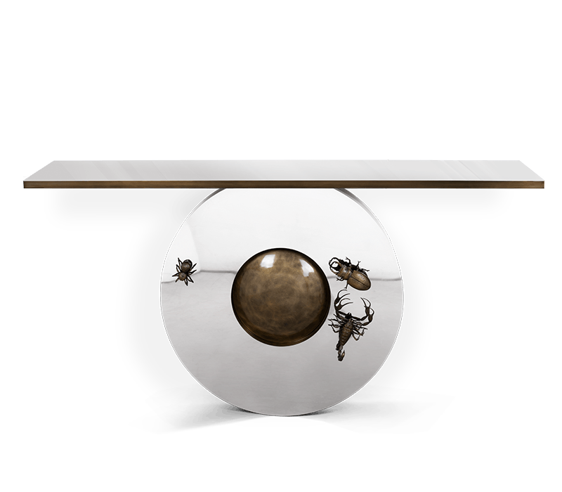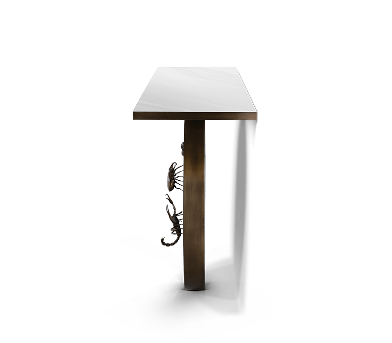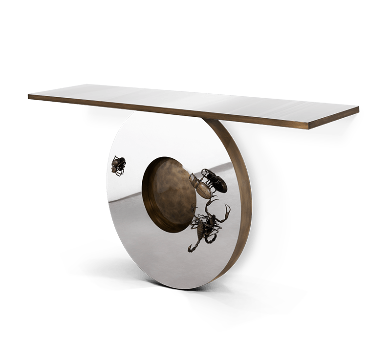 The Metamorphosis console table has come to symbolize the evolutionary history of life, representing the last stage of the cycle through the usage of sculpted fossils on display at the top of the table. This Console embodies handmade techniques such as hammering and polishing, executed by some of the best craftsmen in the country. Strong geometric design is coupled by two brass plated feet with casted brass details. A unique product for those who have a peculiar taste for limited edition pieces and conceptual designs.