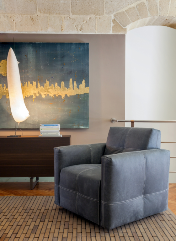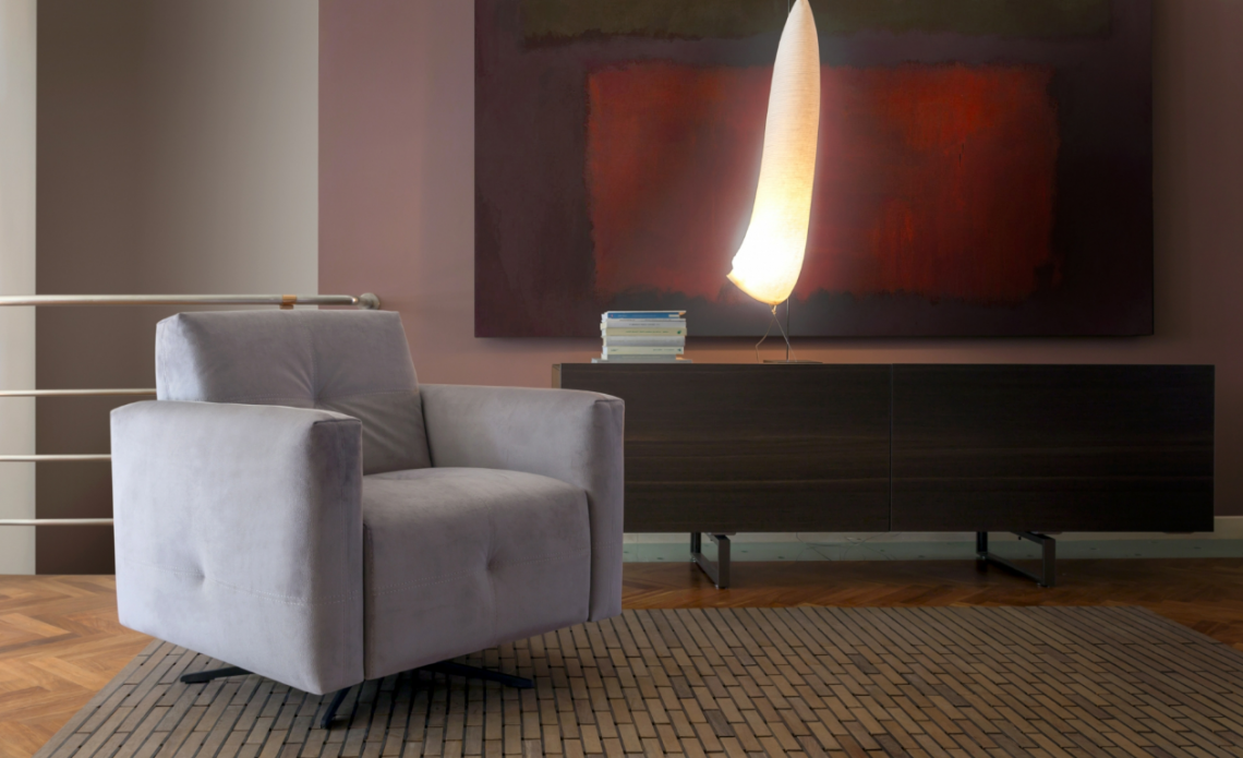 Il modello Nicolas prevede anche la versione poltroncina, una seduta compatta che differisce dal divano per la spalliera fissa e le dimensioni ridotte. La poltroncina Nicolas è disponibile nella versione fissa o con base aperta e piedino alto o con base chiusa, e nella versione girevole o girevole con dondolo.