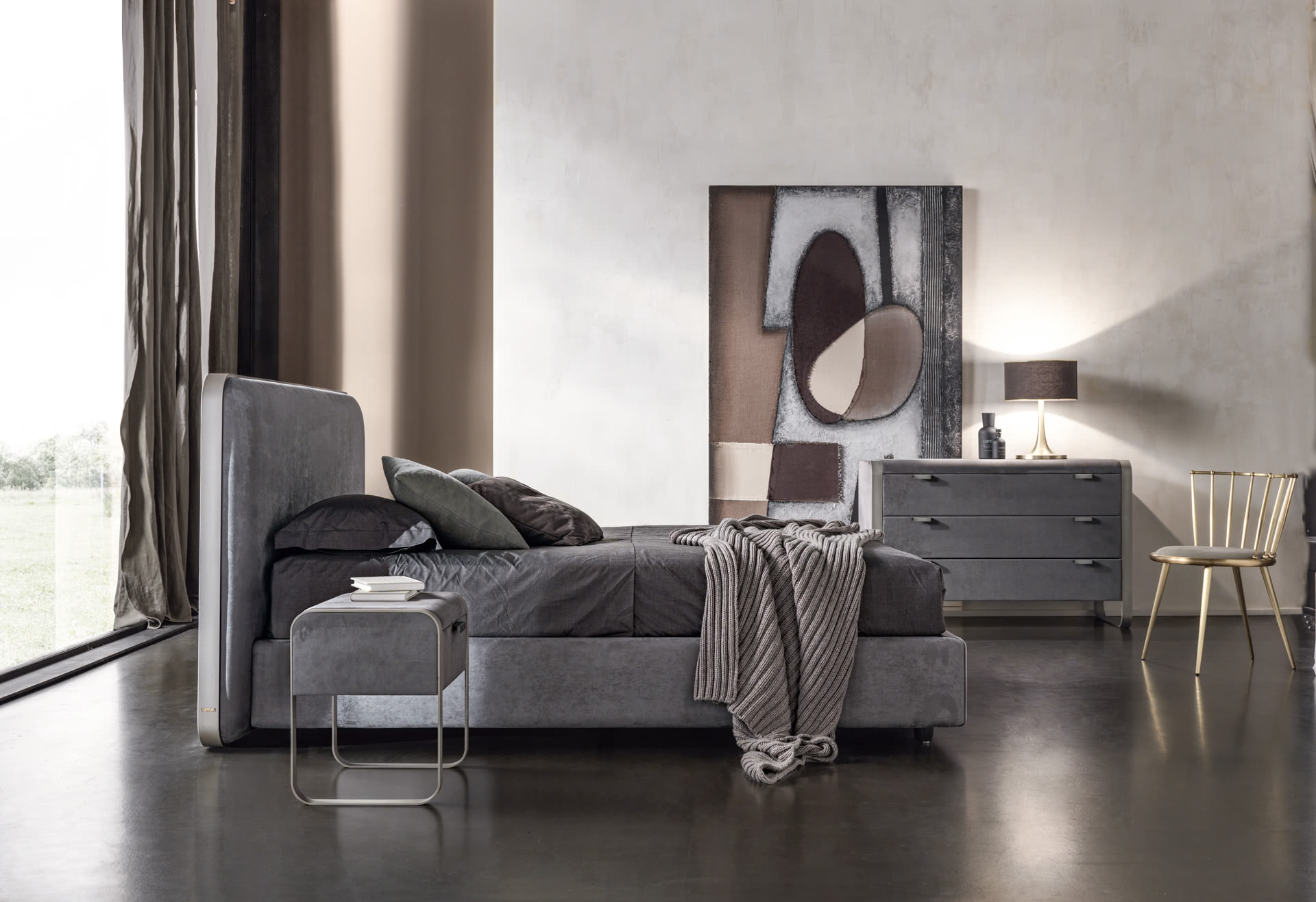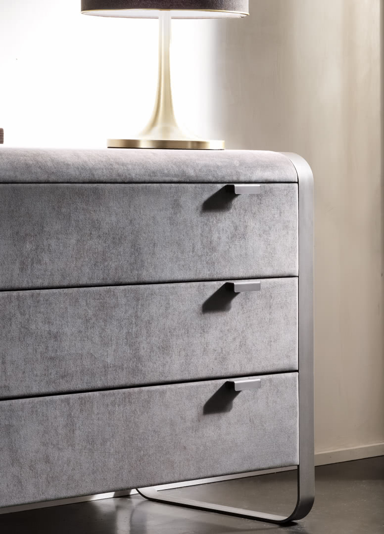 I cassetti, a richiamo frenato, e il top arrotondato sono realizzati in legno e completamente rivestiti in pelle o ecopelle. La struttura in metallo può essere finita in bronzo o in ferro patinato per renderlo “vintage”. Il comò Elvis è perfetto per la camera da letto dove insieme ai comodini, crea un gruppo notte moderno.