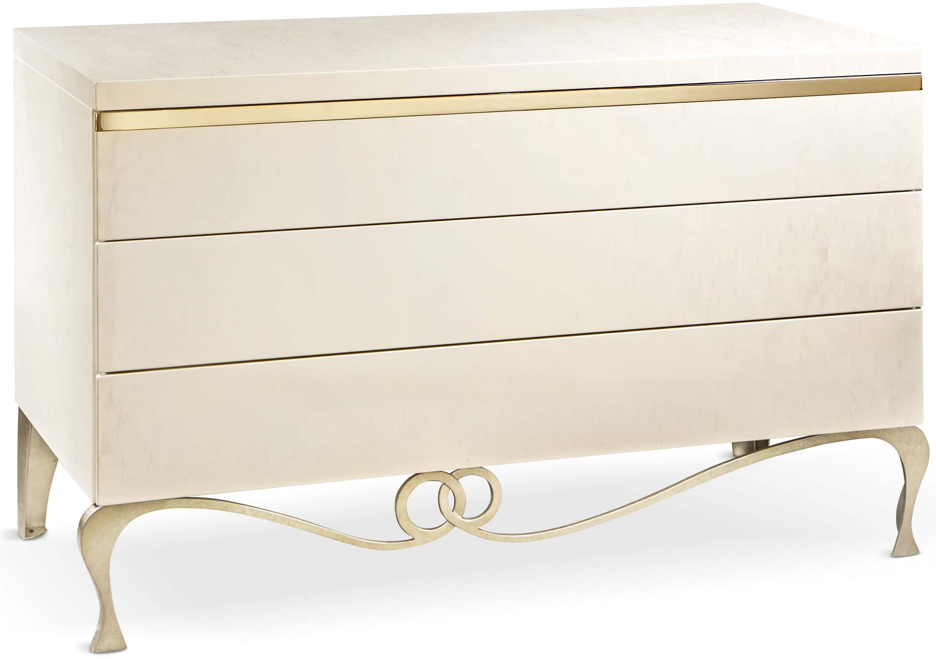La struttura in legno presenta 3 cassetti con inserto in oro pallido e guide ad estrazione totale e richiamo frenato. I piedi e il telaio sono realizzati in ferro, decorati in foglia argento champagne. Il comò J'Adore, insieme ai comodini, crea un gruppo notte elegante e unico.
