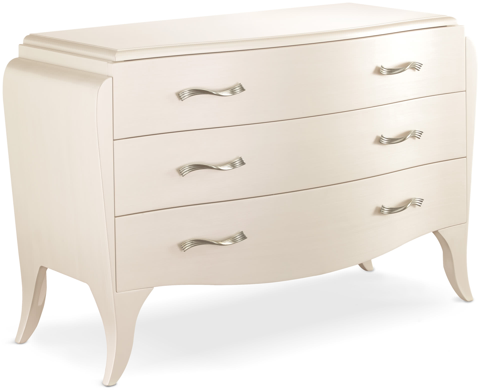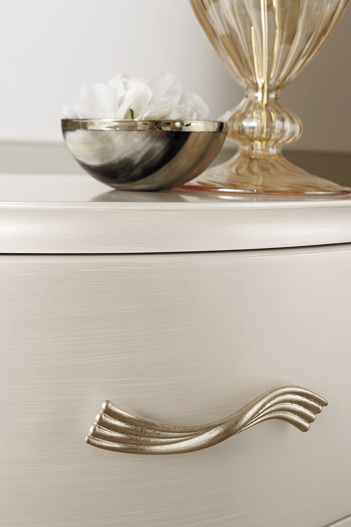 La struttura è decorata in madreperla a pennello o spatolata; le maniglie sono realizzate in metallo con finitura in foglia argento champagne. Il comò Lorenzo insieme ai comodini, crea un gruppo notte perfetto per una camera da letto classica o vintage.