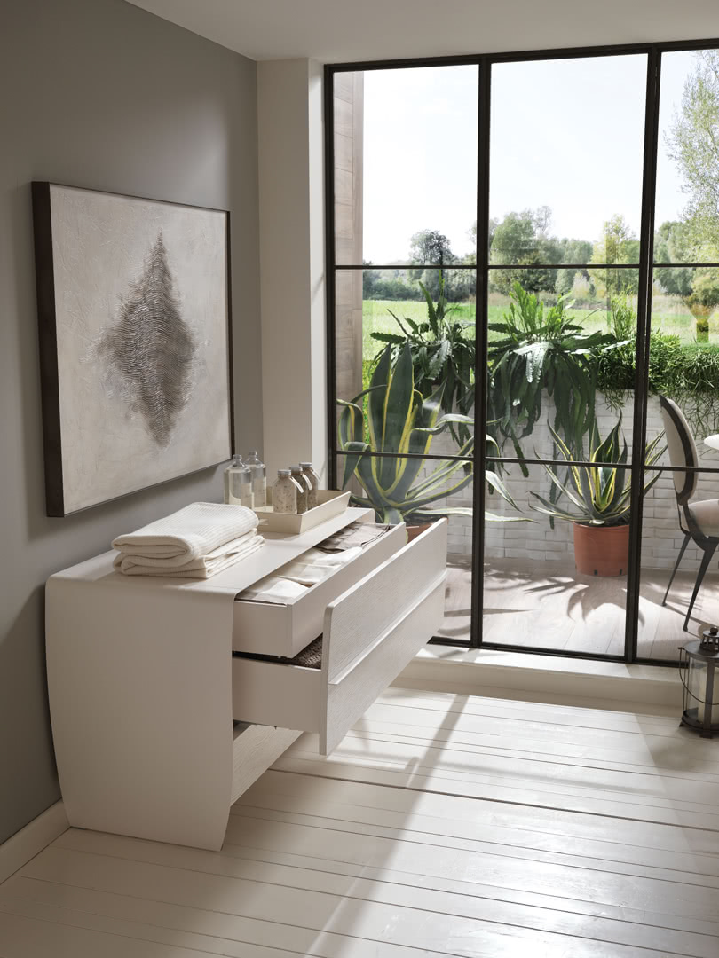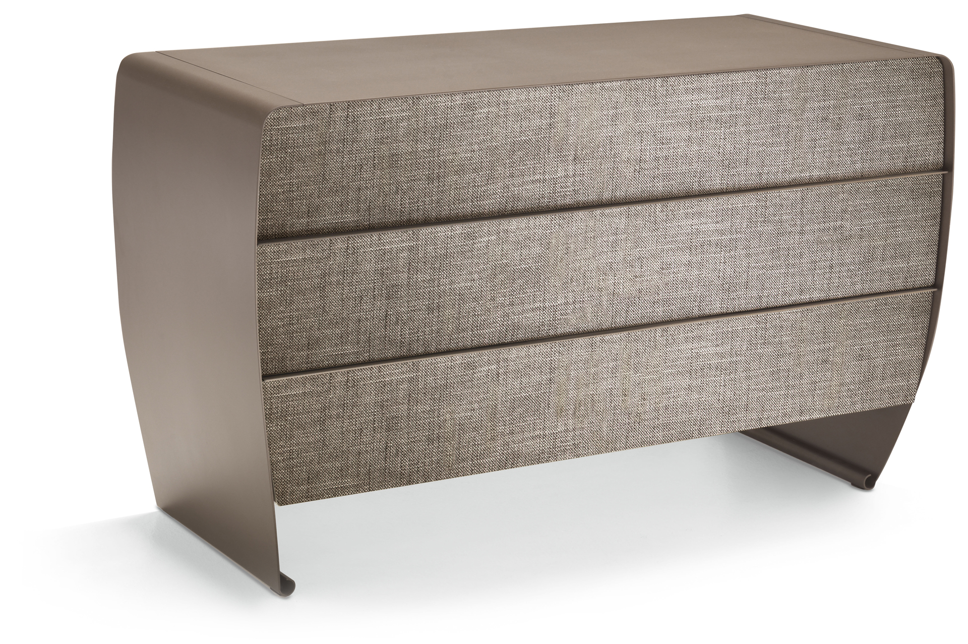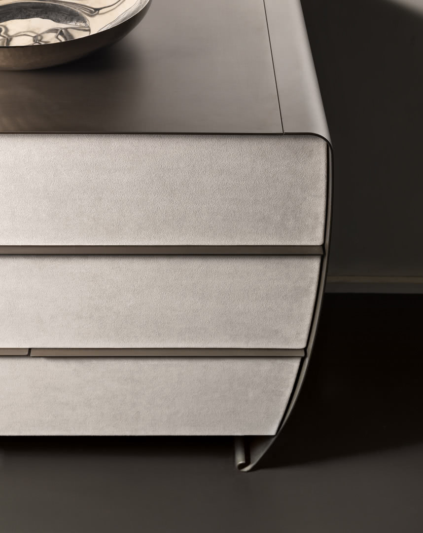 La struttura, in metallo curvato e tagliata a laser, è disponibile nella finitura ferro metallizzato o panna laccato lucido per rendere luminosa una camera da letto moderna. I cassetti, con guide ad estrazione totale e richiamo frenato, sono realizzati con il frontale rivestito in tessuto, pelle o ecopelle. Il comò Taolino, insieme ai comodini, crea un gruppo notte lineare e sofisticato.