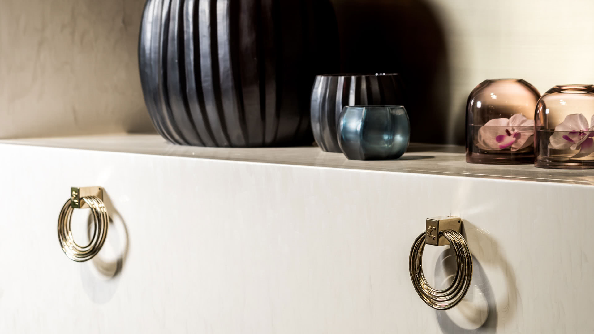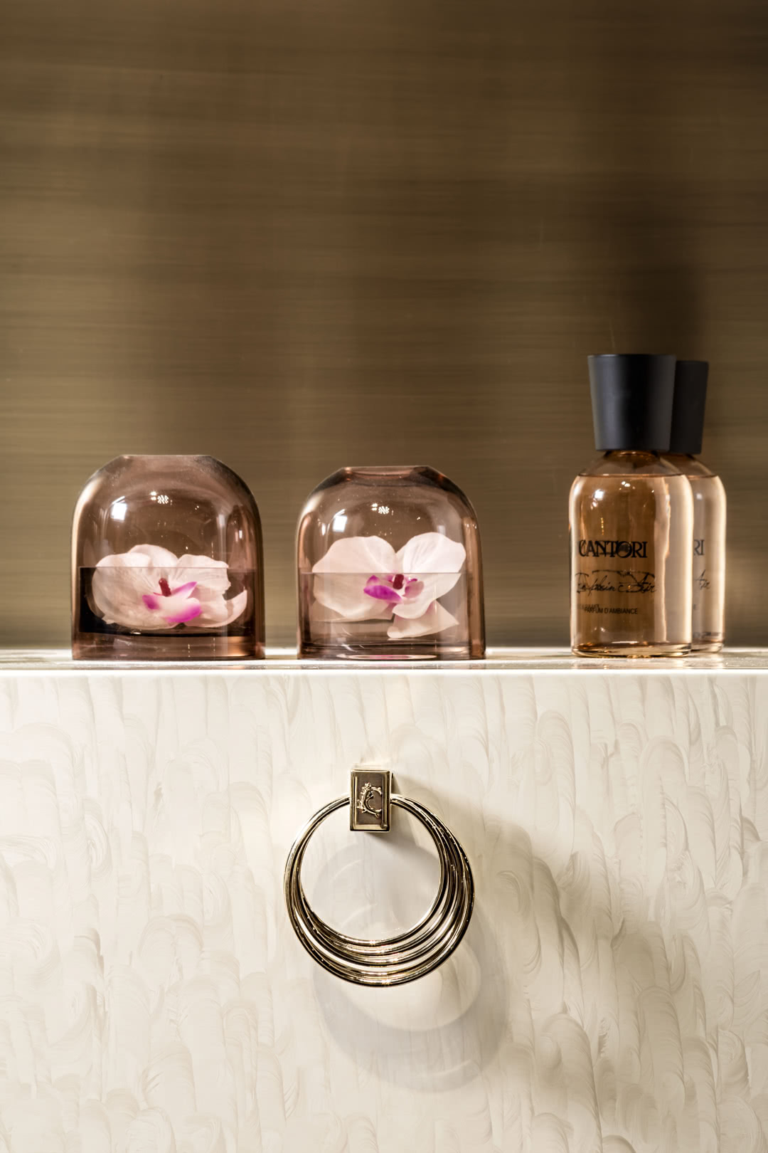 Base in brushed bronze finishing. The jewel-like handles in pale gold finishing are entirely handmade. Their shape draws inspiration from the doorknockers and bangle bracelets. The cabinet, with brushed finishing applied on a bronzed coat, is enriched by these elements. The handles, in fact, soften its squared lines and its rigourous design.