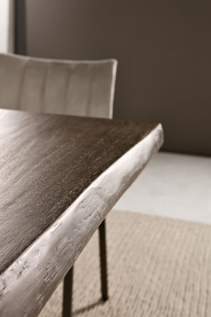 Il piano di questo tavolo moderno in massello di rovere carbon o naturale è smussato irregolarmente mentre il telaio, in ferro pieno, è curvato e rastremato dalla struttura a traliccio.