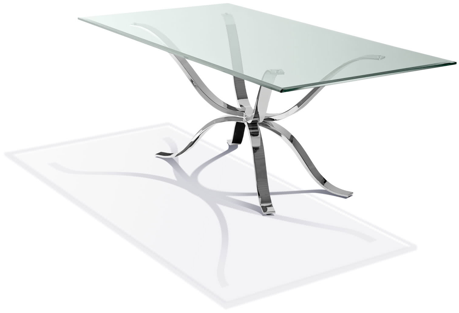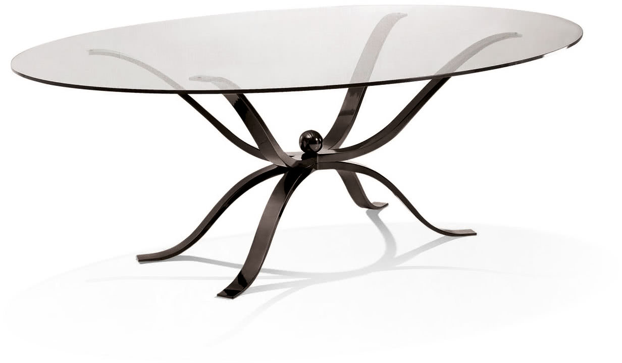 Il top in vetro è disponibile in vetro trasparente o bronzato con bordo molato o a filo lucido. La struttura portante, realizzata in ferro pieno, viene rastremata, curvata a freddo e lucidata a mano.