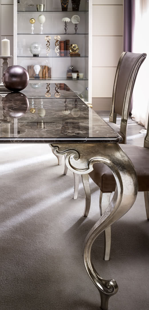 Tavolo classico in vetro o in marmo George con piano rettangolare e gambe in fusione d’alluminio.