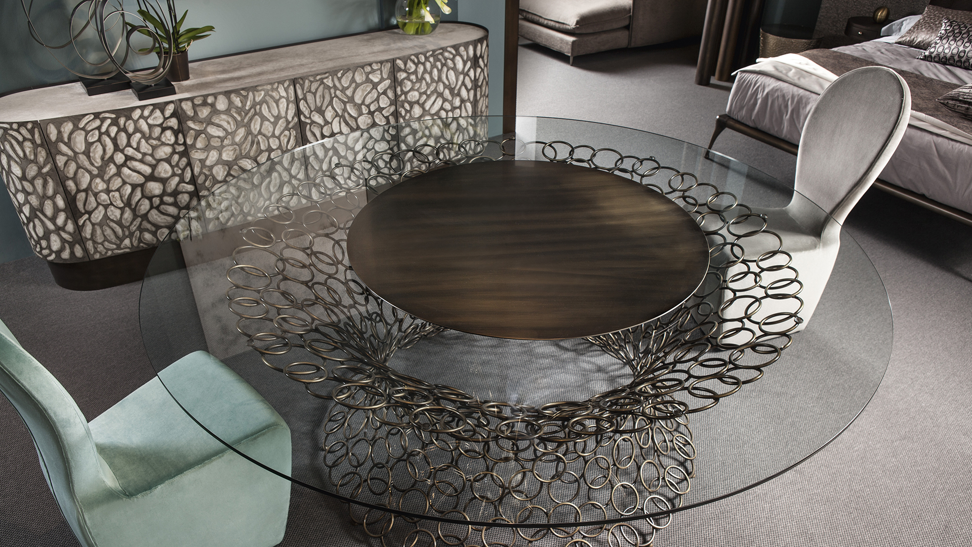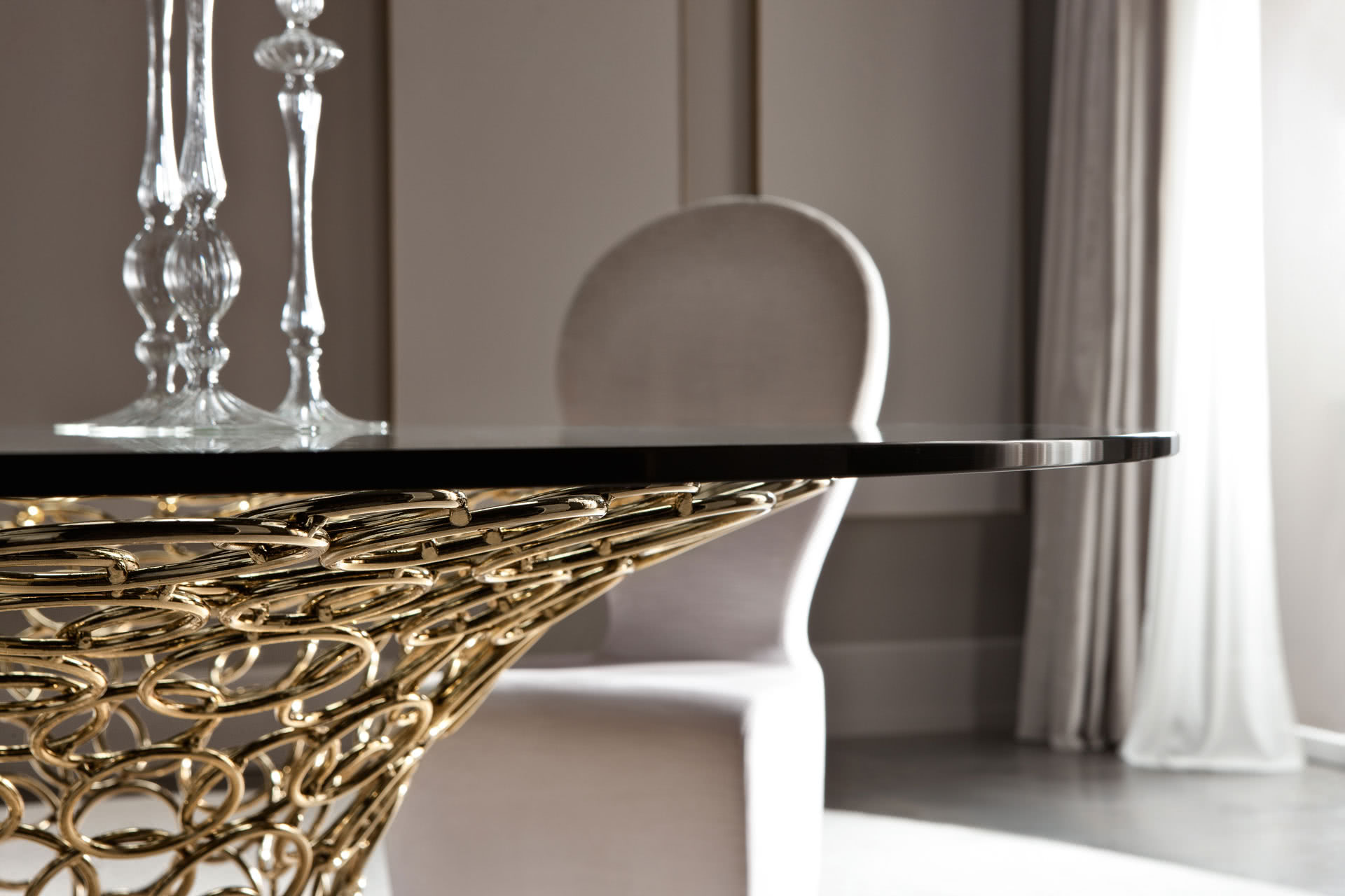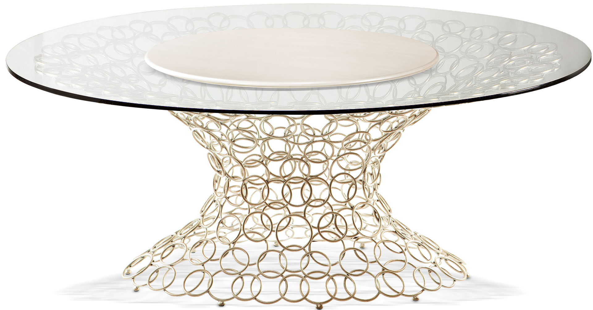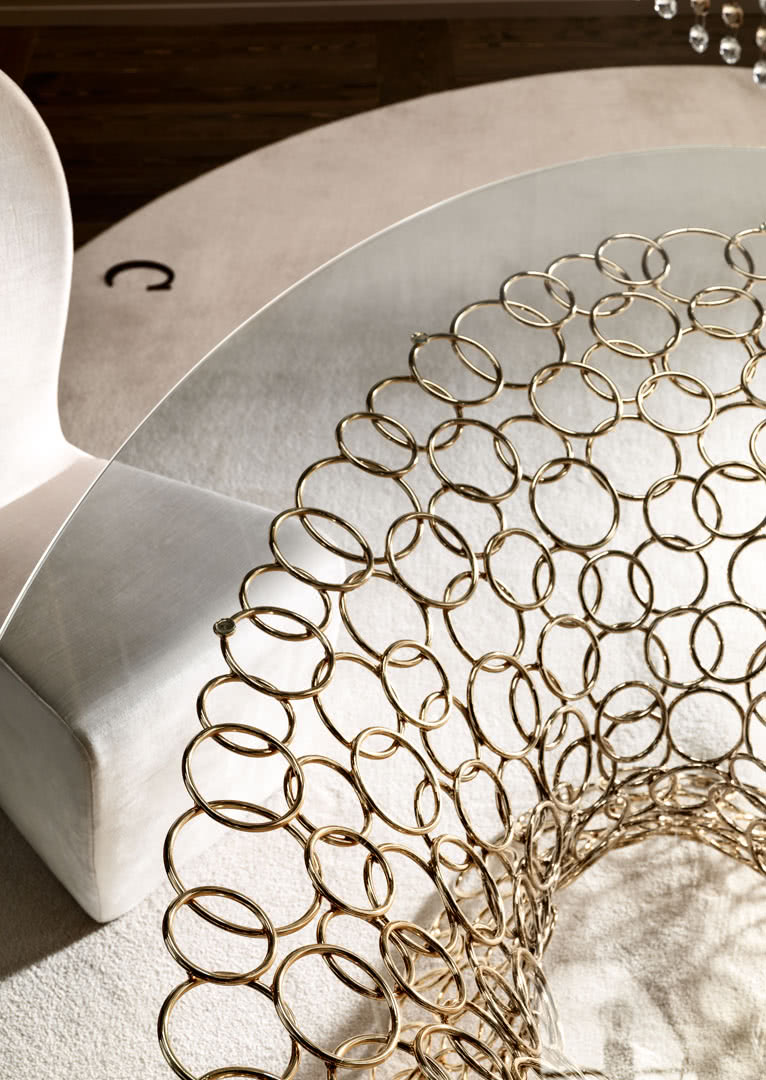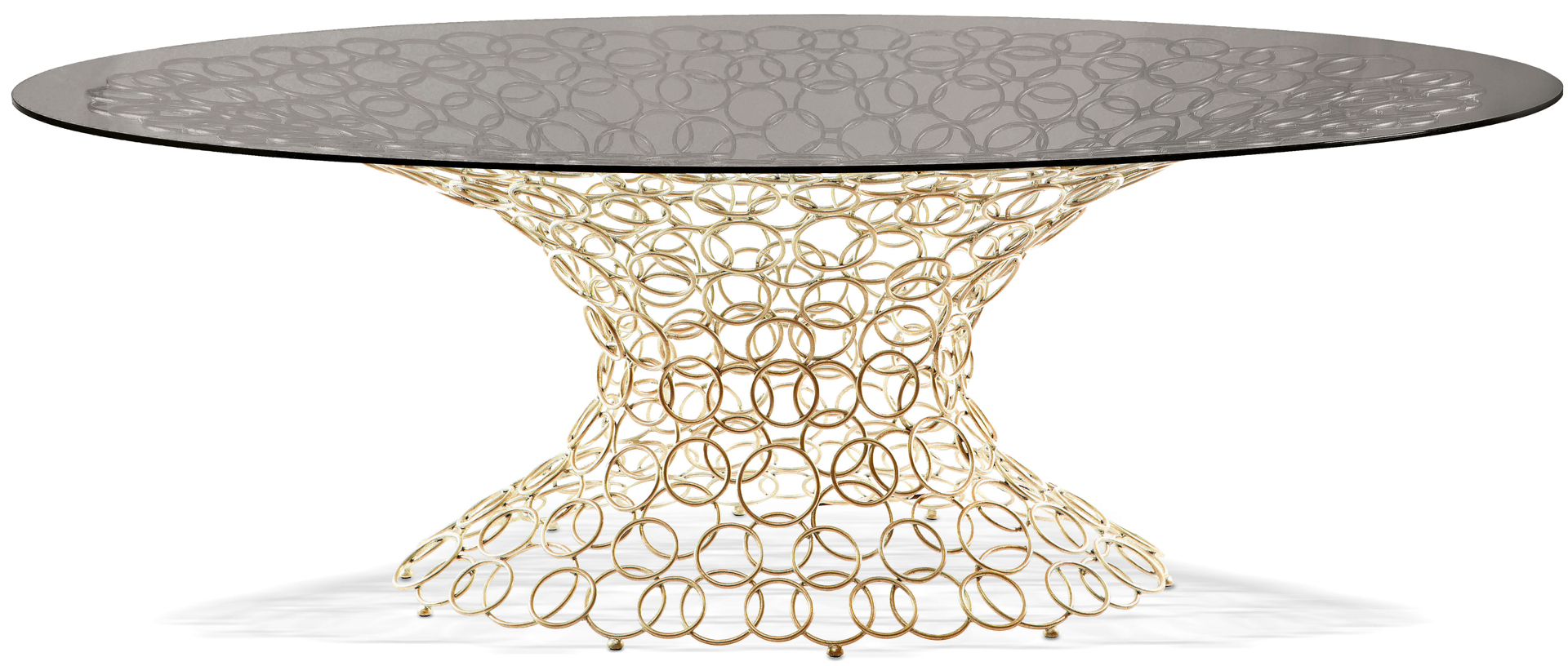 Il piano in vetro molato a filo lucido, è disponibile nella versione trasparente o fumé bronzo. La base è realizzata con tondini in ferro pieno che, saldati tra loro uno ad uno, si fondono tra loro a formare un vortice di cerchi. Questi vengono trafilati, curvati e levigati manualmente. La decorazione, la patinatura e la posa della foglia sono realizzate completamente a mano. La finitura è realizzata a bagno di galvanica in oro o in nichel nero.
