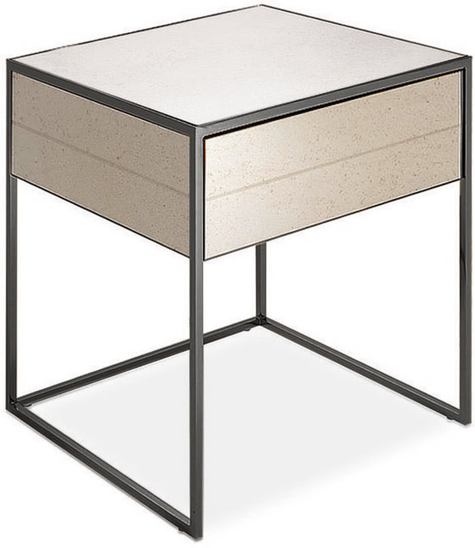 La struttura è in ferro pieno quadro con finitura a bagno di galvanica in ottone spazzolato, nichel nero o in ferro metallizzato. Il top e il cassetto sono rivestiti in specchio bronzato e molato a filo lucido. I comodini Narciso sono perfetti in una camera da letto dal design moderno o come tavolino lato sofà in sala.