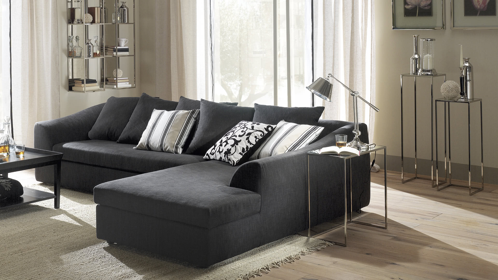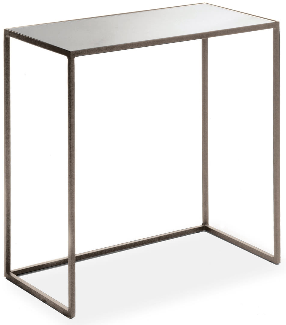 La struttura è in ferro pieno quadro con finitura a bagno di galvanica in ottone spazzolato, nichel nero o in ferro metallizzato. Il top è rivestito in specchio bronzato a filo lucido. Un tavolino dal design moderno e dalle linee pulite.