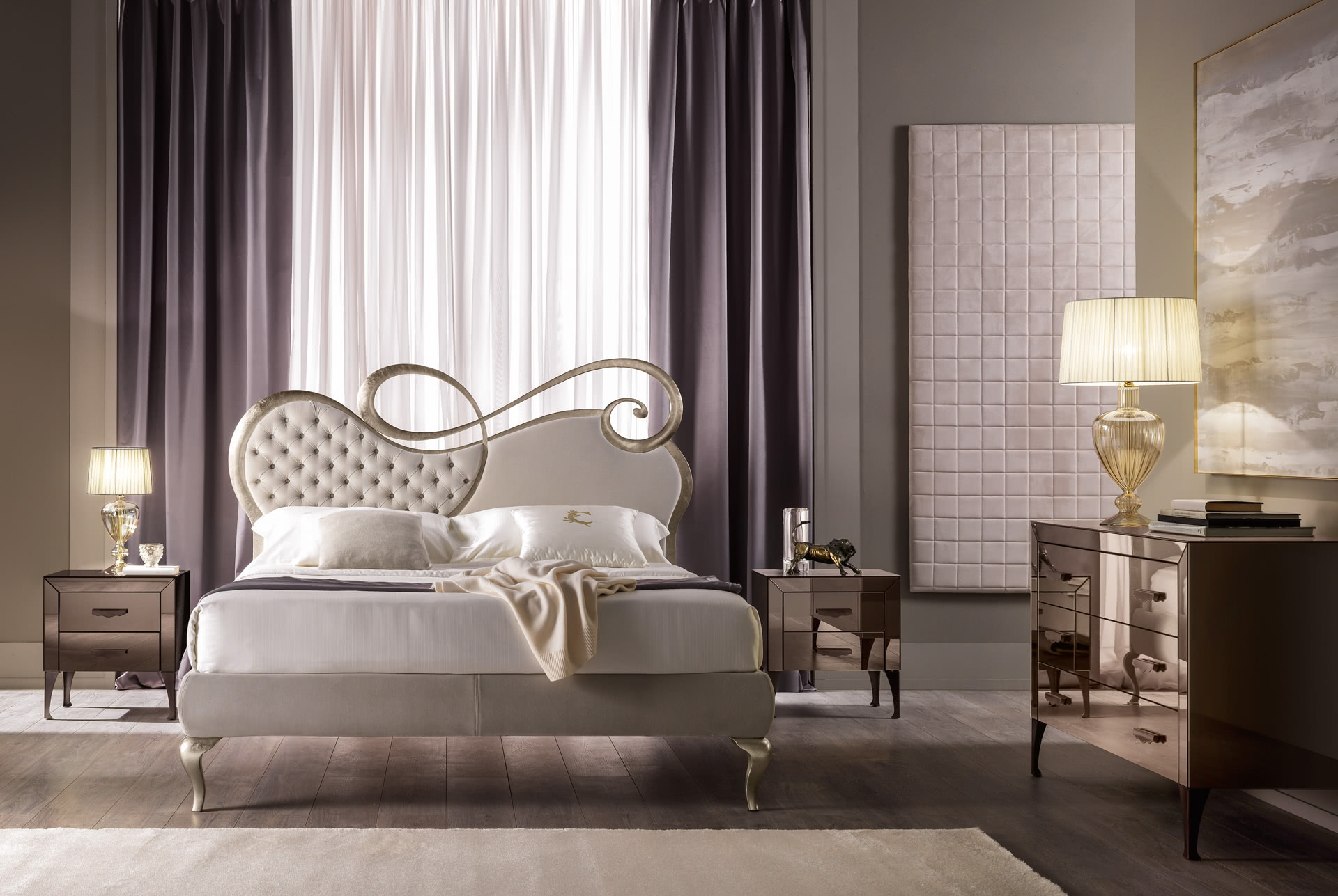 La testata in legno è imbottita e rivestita in pelle, ecopelle o tessuto, con particolari in ferro, tagliati a laser e bombati, finiti a mano in foglia argento champagne o in bronzo. Il giroletto è rivestito in tinta con la testata mentre i piedi sono in fusione di alluminio. Le componenti rivestite possono essere realizzate anche con tessuto o pelle fornito dal cliente. Il letto Chopin è disponibile in varie dimensioni per reti da cm: 160x200 (letto matrimoniale) e 180x200 (letto matrimoniale) anche nella versione con box contenitore; perfetto per una camera da letto giovane e romantica.
