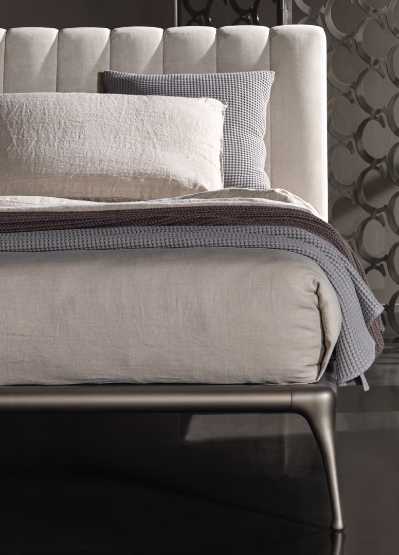 La struttura perimetrale e i piedi sono in fusione di alluminio, decorati in bronzo; la testata imbottita, con trapuntatura verticale, è rivestita con velluto, tessuto, pelle, ecopelle o con tessuto/pelle fornito dal cliente. Un’aura vintage che rende accogliente l’intera camera da letto. Il letto Iseo è disponibile in varie dimensioni per reti da cm: 120x200 (letto da una piazza e mezzo), 140x200 (letto alla francese) e 160x200 (letto matrimoniale).