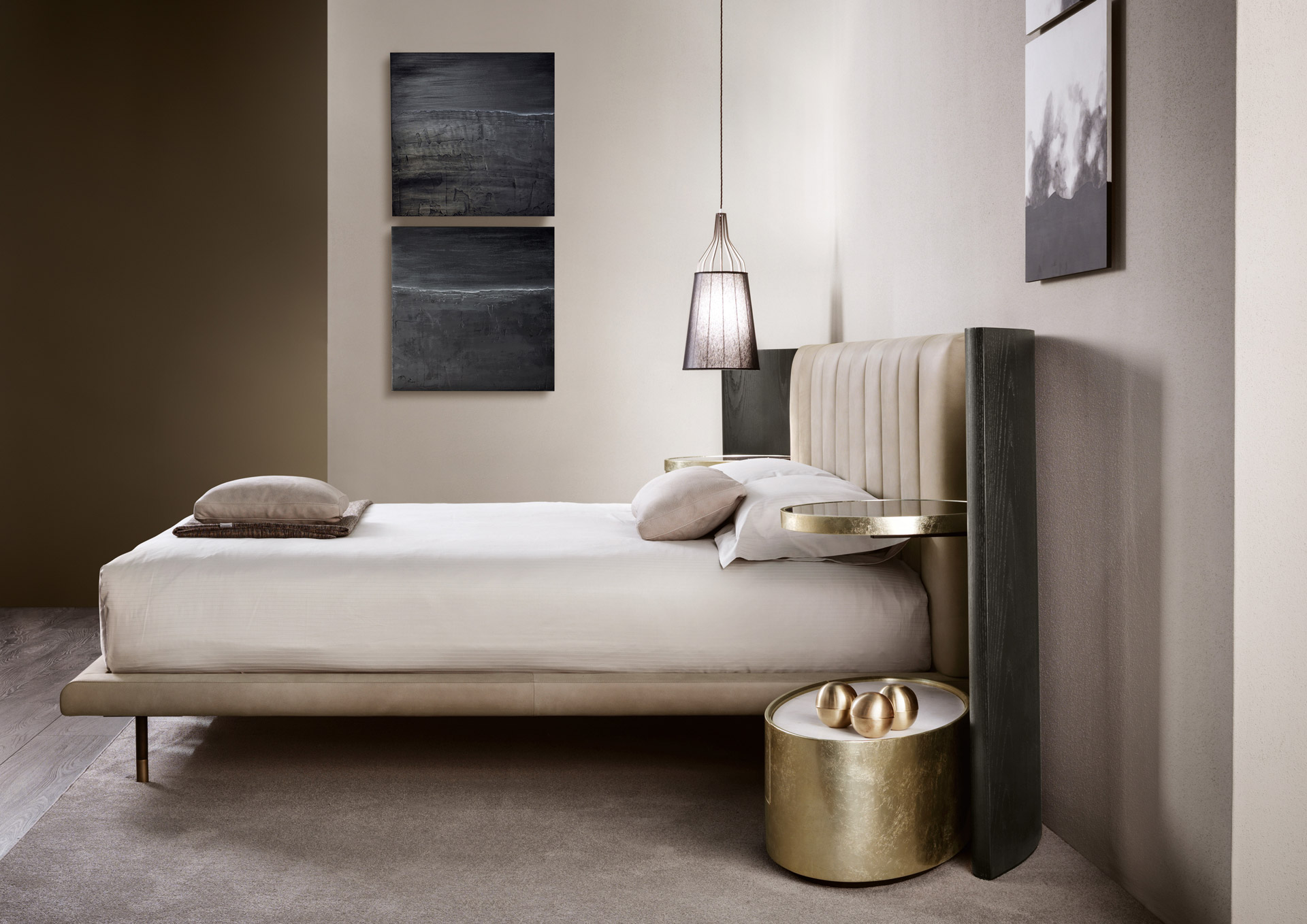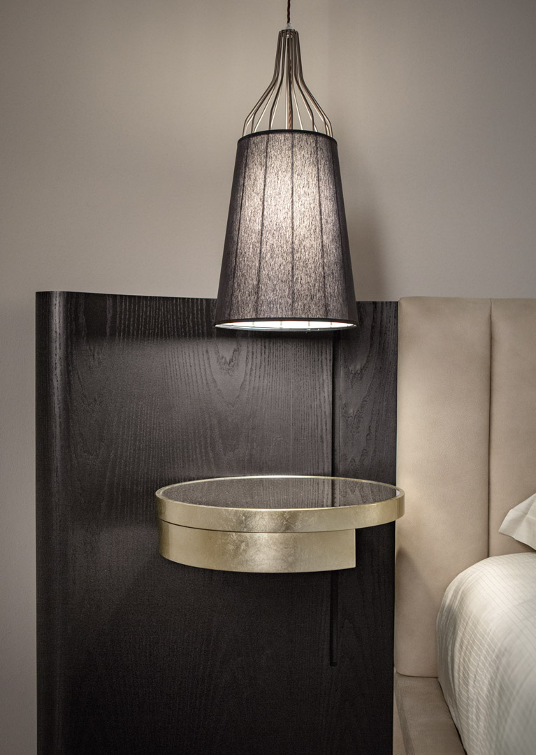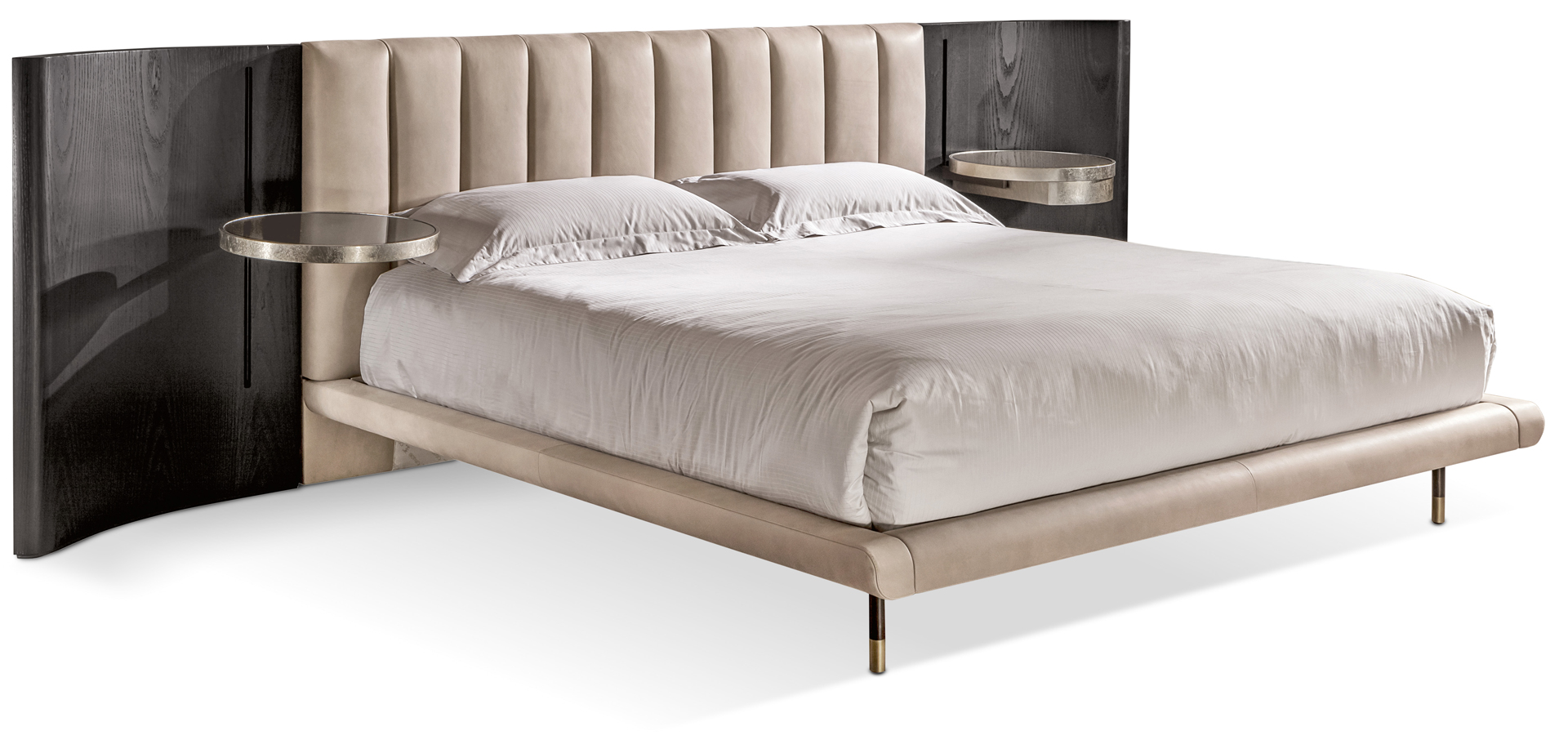 La struttura interna è in legno multistrato e massello di pioppo e faggio, con riporti negli stessi materiali. Il rivestimento strutturale è in poliuretano espanso indeformabile e falda sintetica. La testata ampia, in legno di frassino o noce nazionale impiallacciato, avvolge agli estremi in un rassicurante abbraccio ideale. Il rivestimento della testa e del giroletto è personalizzabile con tessuto, pelle o ecopelle. Interessante l’inserimento dei due piani d’appoggio, uno fisso e l’altro mobile, che grazie alla rotazione permettono un miglior utilizzo. Il letto Mirage con il suo design dona un carattere unico alla camera da letto.