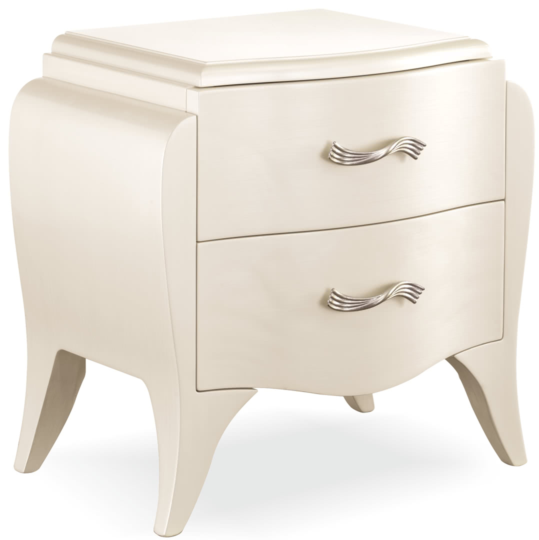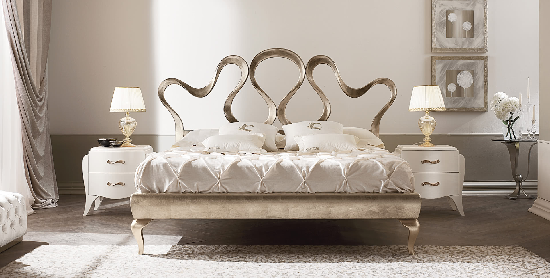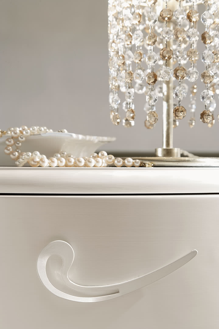 La struttura è decorata in madreperla a pennello o spatolata; le maniglie sono realizzate in metallo con finitura in foglia argento champagne. I comodini Lorenzo, insieme al comò, creano un gruppo notte perfetto per una camera da letto classica o vintage.