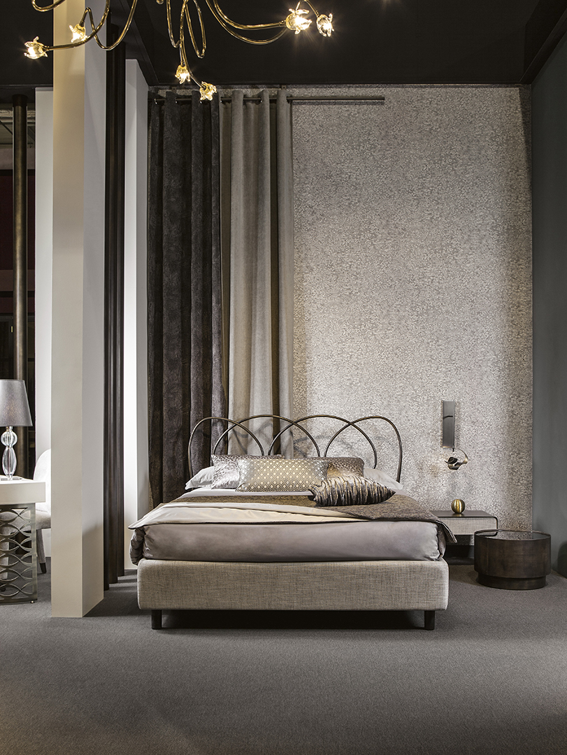 La base, con un cassetto a scomparsa, è decorata in bronzo mentre il top è realizzato in specchio fumé bronzo. Dei comodino dal design moderno e pulito che, insieme al comò, creano un gruppo notte elegante e unico.