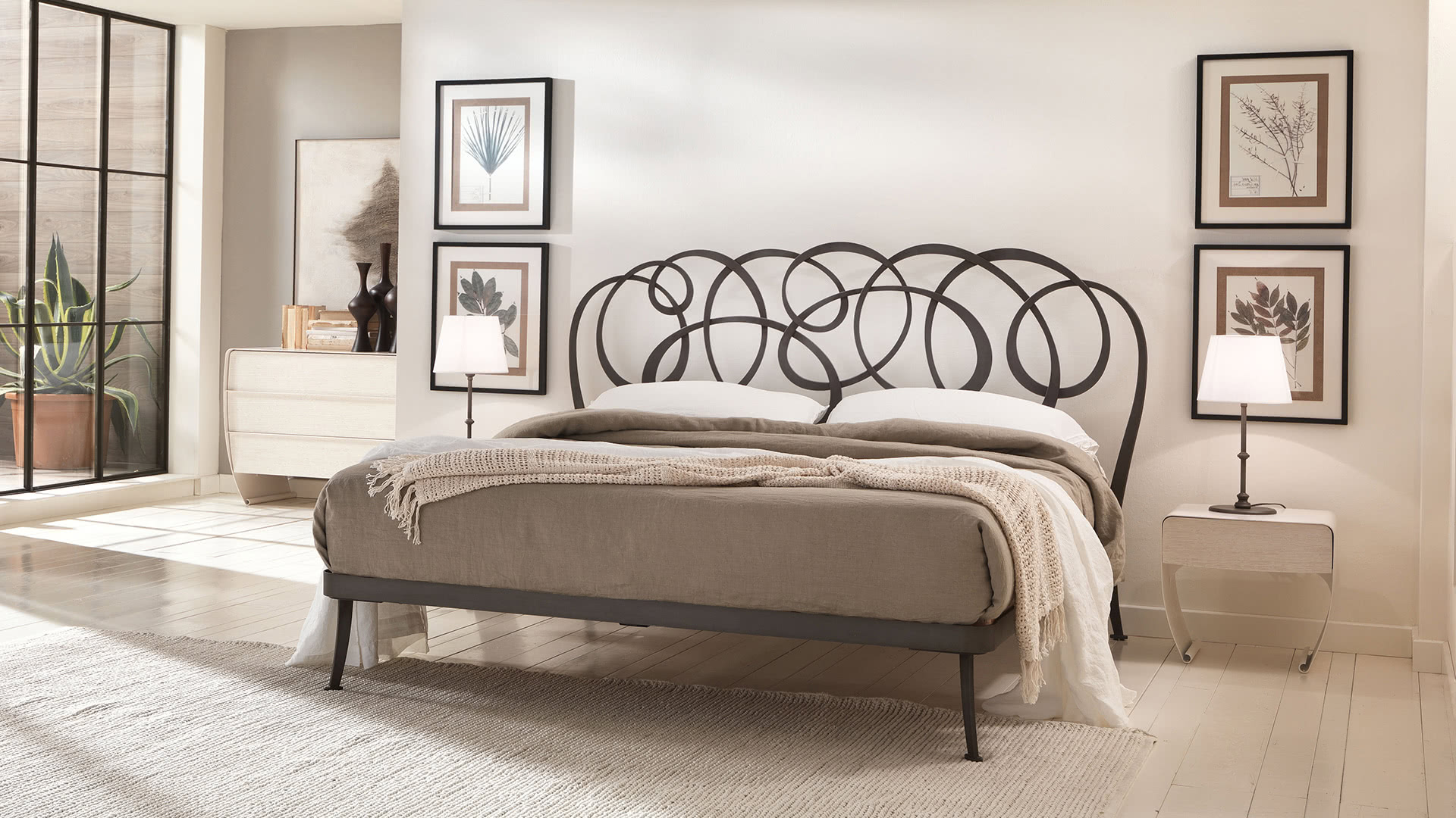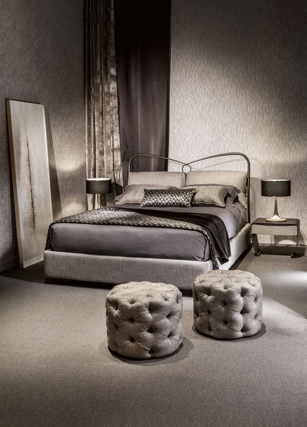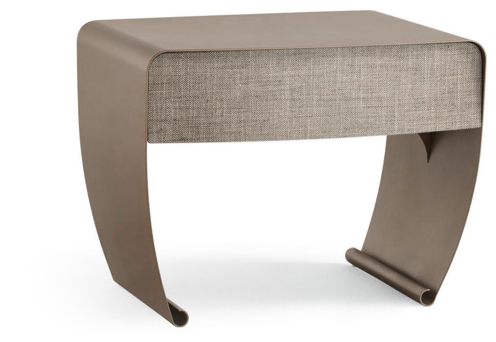 La struttura, in metallo curvato e tagliata a laser, è disponibile nella finitura ferro metallizzato o panna laccato lucido per rendere luminosa una camera da letto moderna. Il cassetto, con guide ad estrazione totale e richiamo frenato, è realizzato con il frontale rivestito in tessuto, pelle o ecopelle. I comodini Taolino, insieme al comò, creano un gruppo notte lineare e sofisticato.