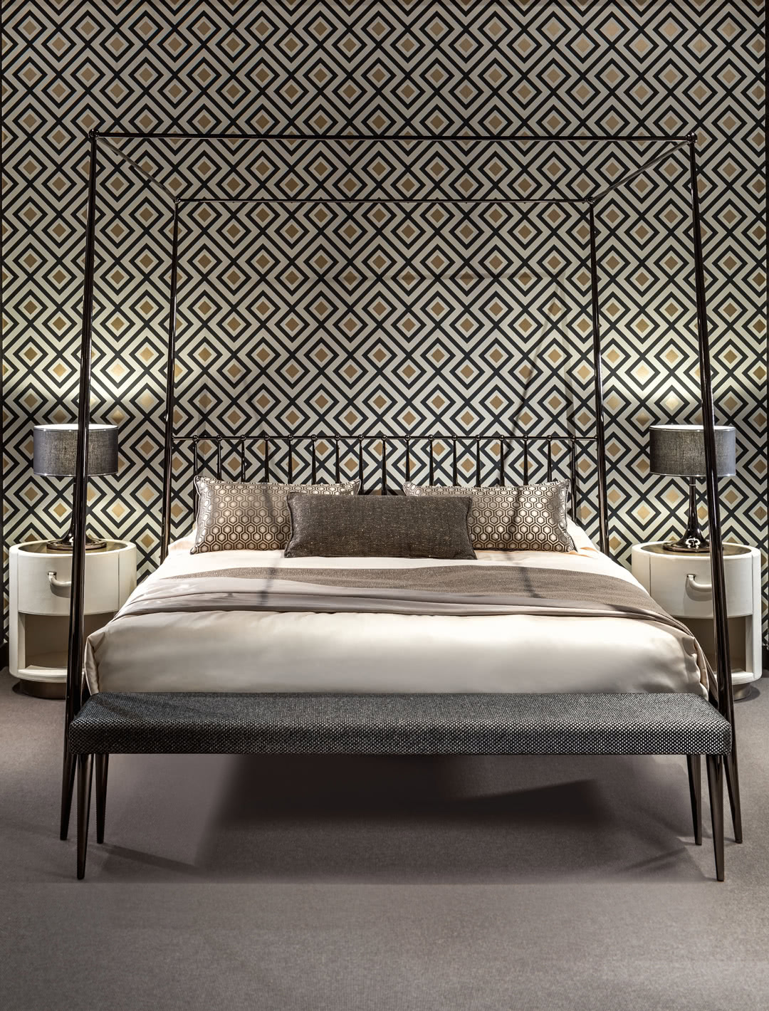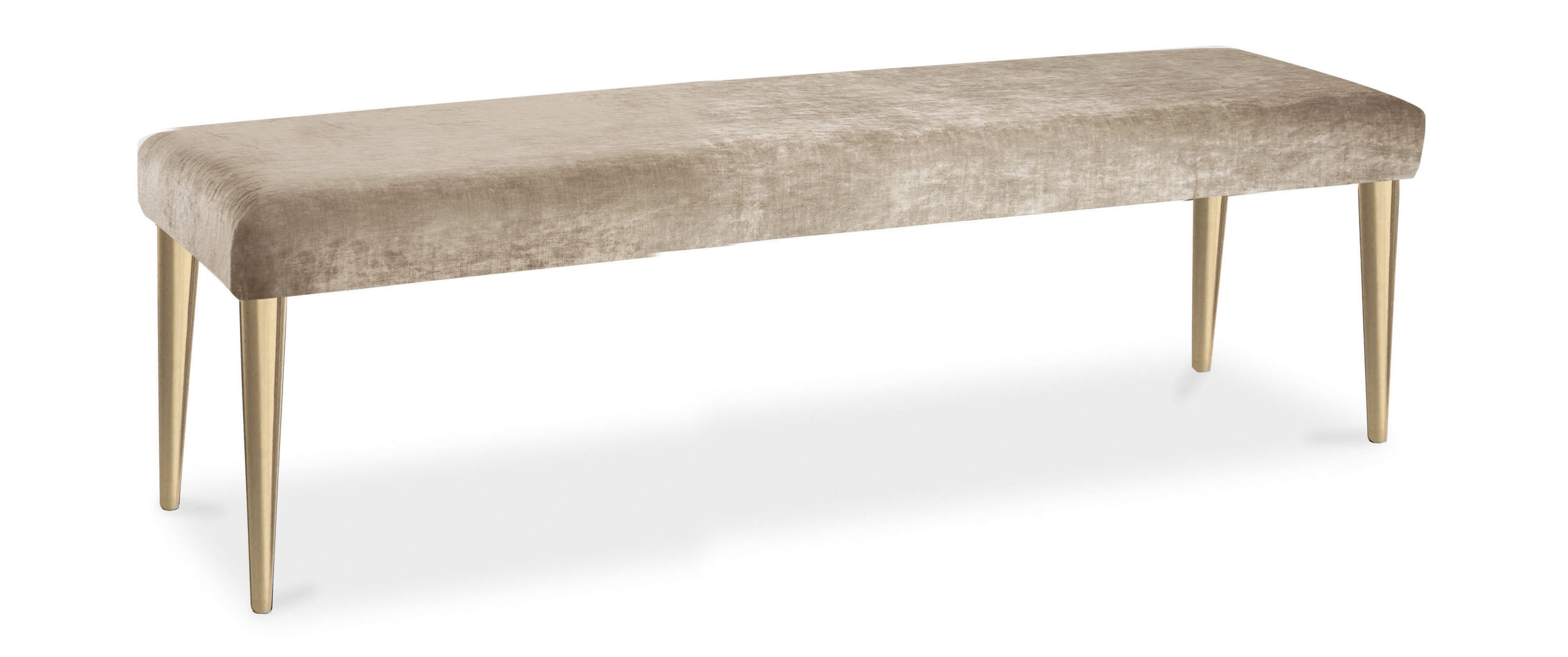 La struttura in ferro, conificato a freddo e lucidato a mano, è realizzata in finitura a bagno di galvanica in oro o nichel nero. La seduta, in legno sagomato, è imbottita in gomma a due densità e rivestita sartoriale anche con tessuto fornito dal cliente. I dettagli nel perimetro sono realizzati in passamaneria. Perfetta come fondo letto in camera.