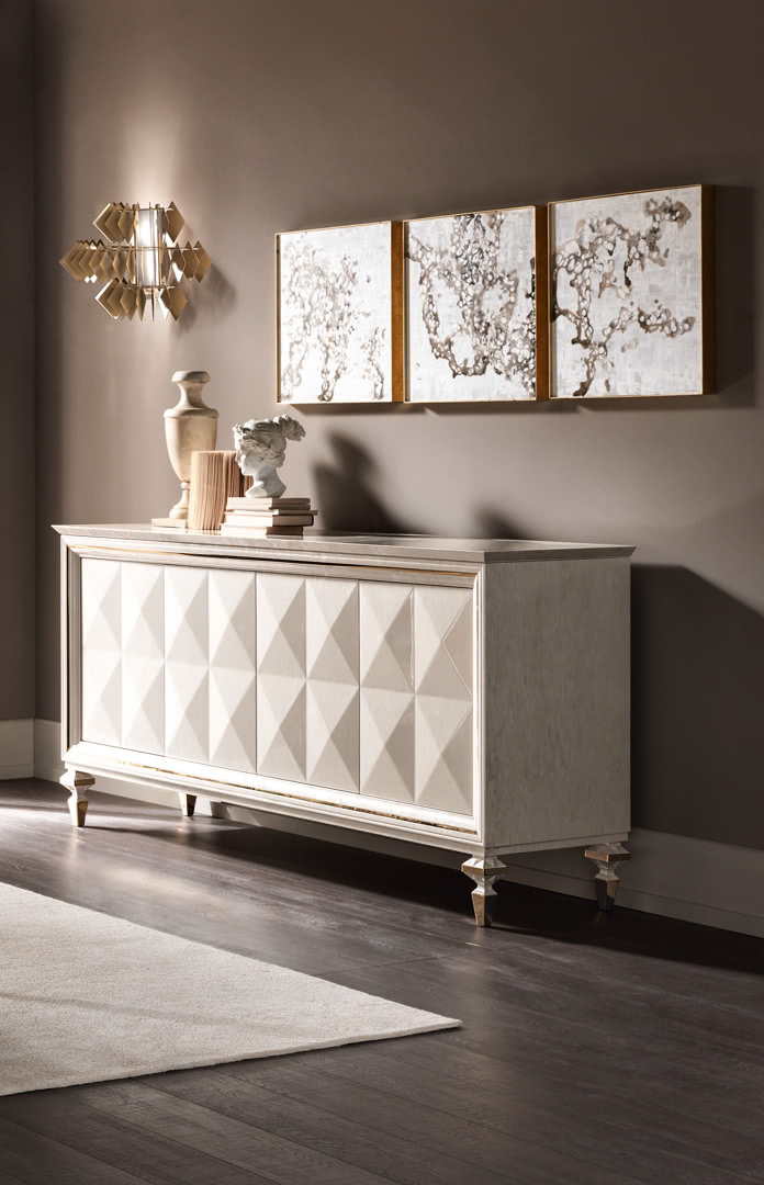 La struttura, in finitura galvanica oro, sostiene dei pendenti romboidali mobili, in acciaio finiti in oro; il paralume interno è realizzato in tessuto per diffondere una luce sobria ma ricca di sfumature. I giochi di riflessi sulle foglie dorate illuminano le stanze e fanno di queste luci il centro focale dello spazio, sia in camera da letto che in sala da pranzo. La nuova collezione di lampade Diamante New comprende il lampadario a 5 e 3 castelli, la lampada da parete e la lampada da tavolo.