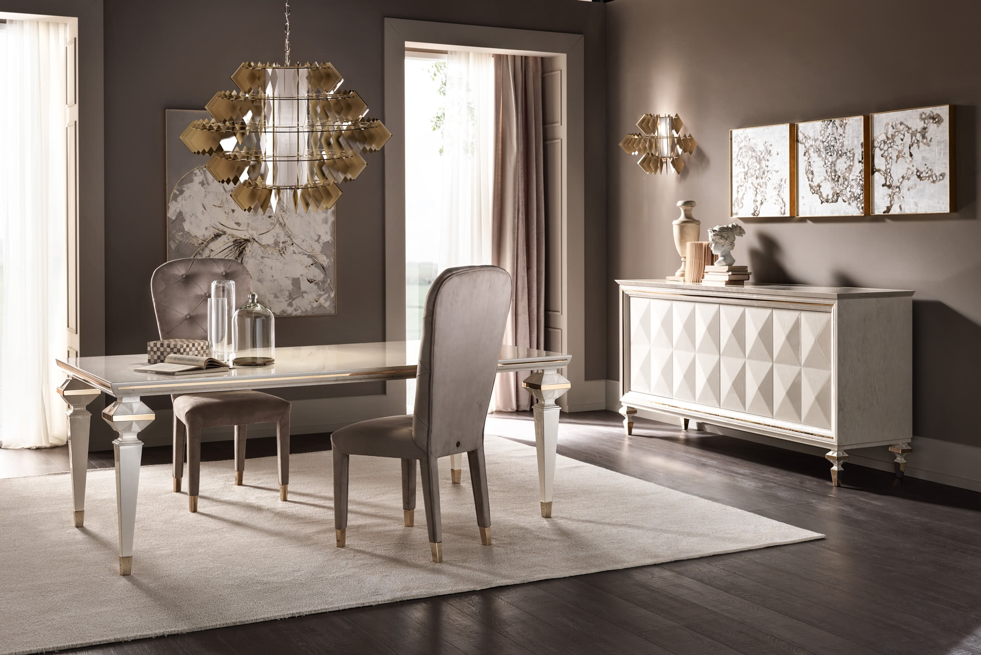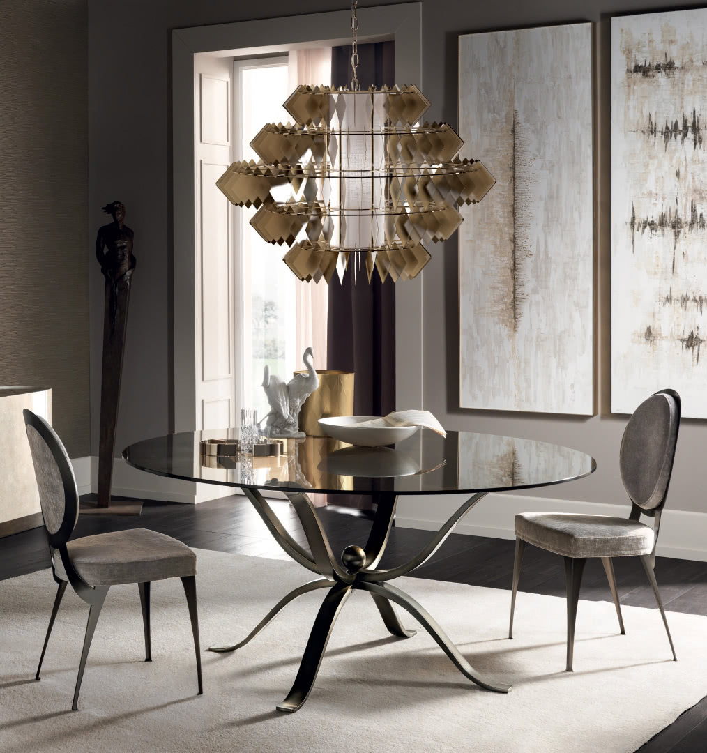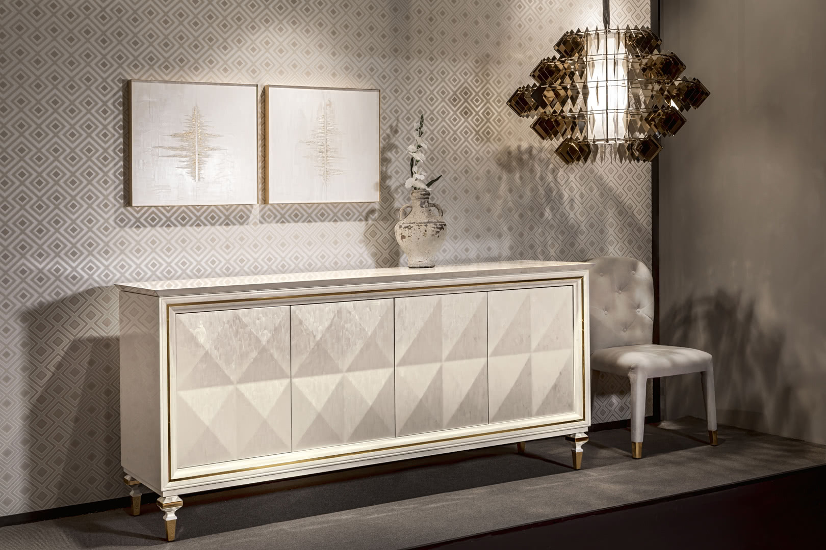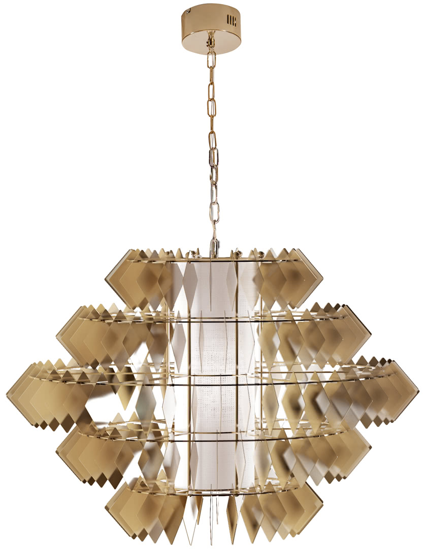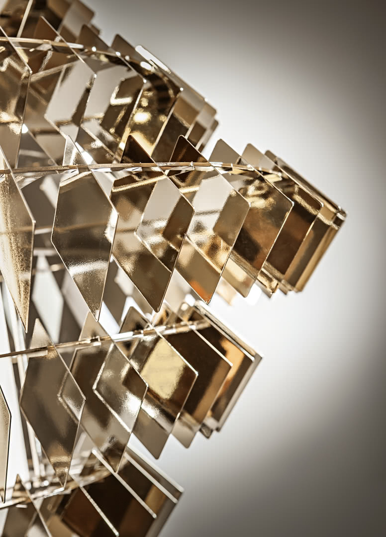 La struttura, in finitura galvanica oro, sostiene dei pendenti romboidali mobili, in acciaio finiti in oro; il paralume interno è realizzato in tessuto per diffondere una luce sobria ma ricca di sfumature. I giochi di riflessi sulle foglie dorate illuminano le stanze e fanno di queste luci il centro focale dello spazio, sia in camera da letto che in sala da pranzo. La nuova collezione di lampade Diamante New comprende il lampadario a 5 e 3 castelli, la lampada da parete e la lampada da tavolo.