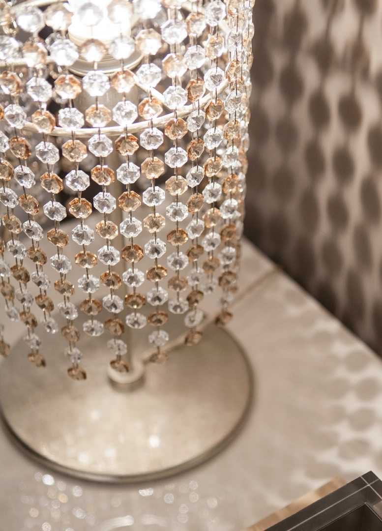 La struttura è finita in foglia argento champagne, realizzata a mano; il paralume, realizzato con pendenti di vetro a due colori tagliati diamante e montati a mano, regalano un gioco di luci unico alla sala e alla camera da letto. Una lampada da tavolo dal gusto eclettico, perfetta sia per un arredamento classico che moderno.