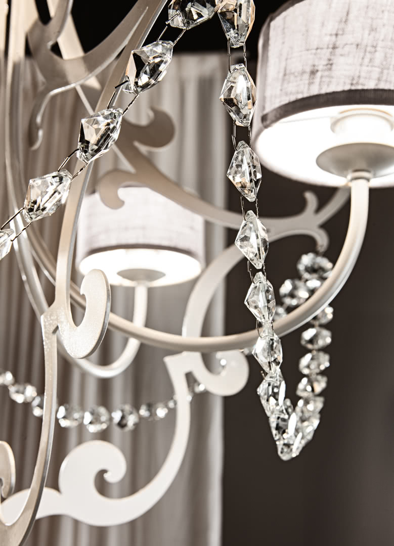 La struttura è in acciaio, tagliato a laser, finita in oro, madreperla, nichel o nichel nero; i paralumi a cilindro sono realizzati in lino accoppiato e autoestinguente. Un lampadario impreziosito da fili di vetro a due colori tagliati a diamante e montati a mano; perfetto per una camera da letto, una sala o un ingresso dal sapore internazionale e sofisticato.