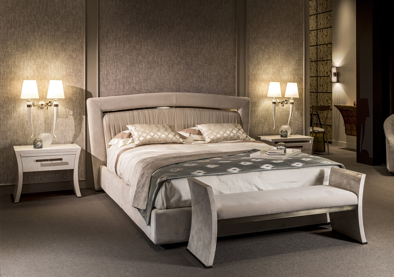 La struttura a forma di corno è in acciaio, conificato e curvato, con decorazioni tagliate a laser e dettagli finiti oro; i paralumi a cono sono realizzati in lino accoppiato e autoestinguente. Una lampada da parete ideale per una camera da letto, una sala o un ingresso dal sapore internazionale e sofisticato.