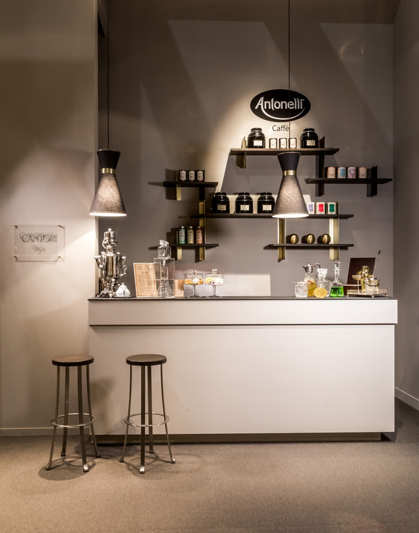 La struttura, con fascia di attacco a paralume, è realizzata in ferro, curvato e sagomato, con finitura in nichel nero o oro; il paralume fisso, in lino, ha la forma di due tronchi di cono accoppiati. Un design moderno per un lampadario eclettico, perfetto in un bar, una hall, sopra ai comodini in una camera da letto o in coppia sopra un tavolo da pranzo.