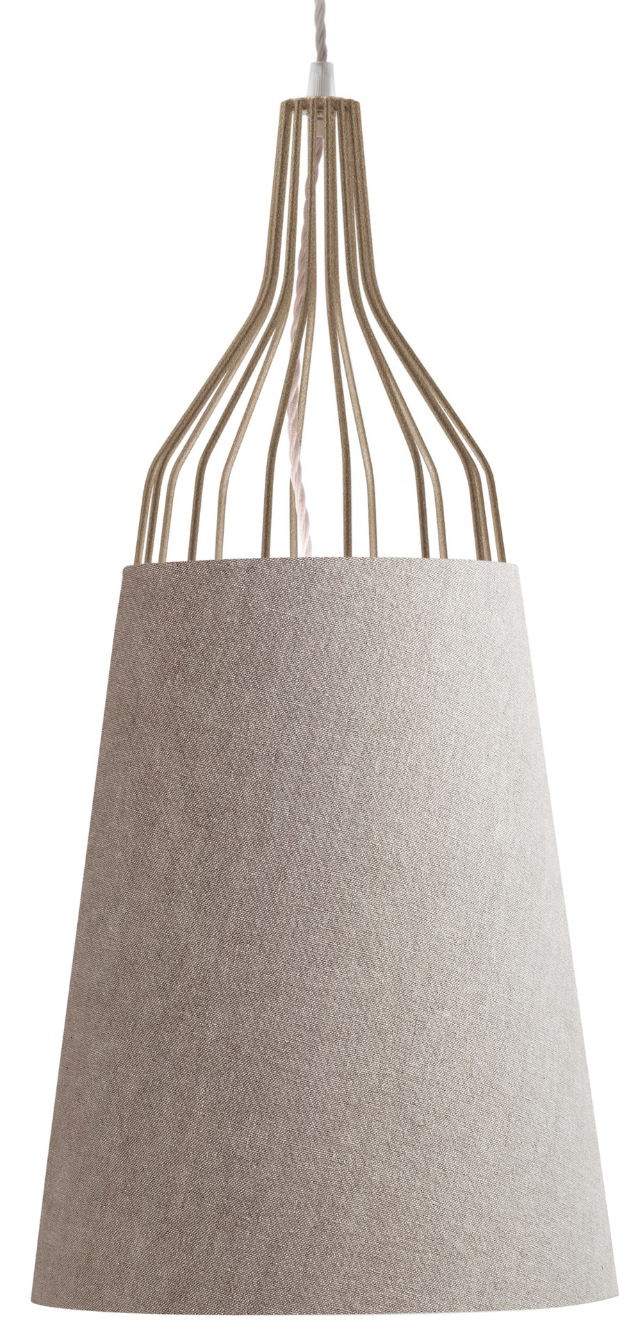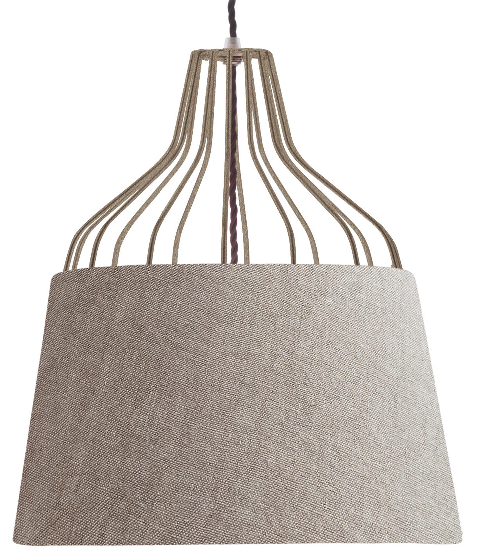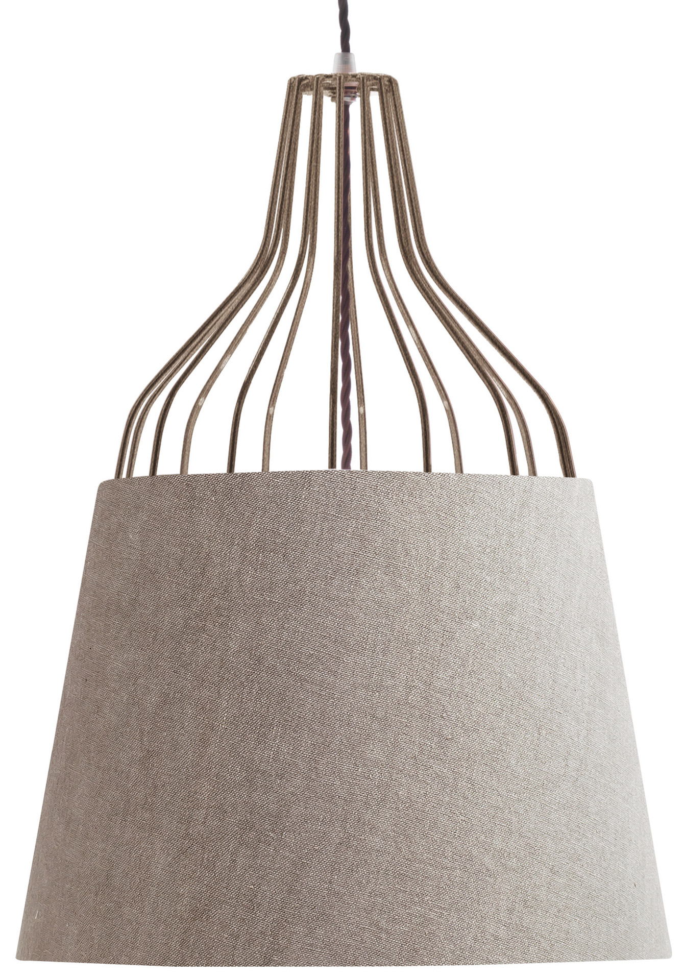 La struttura a gabbia è realizzata in tondino di acciaio e fusione di ottone, con saldature a filo e ottone, e finitura in galvanica oro, rame, nichel nero o ferro metallizzato. Il paralume a tronco di cono è in cotone o lino accoppiato. Un lampadario dal design moderno ma adatto ad ogni stile, perfetto sopra il comodino in camera da letto o sopra il tavolo in soggiorno.