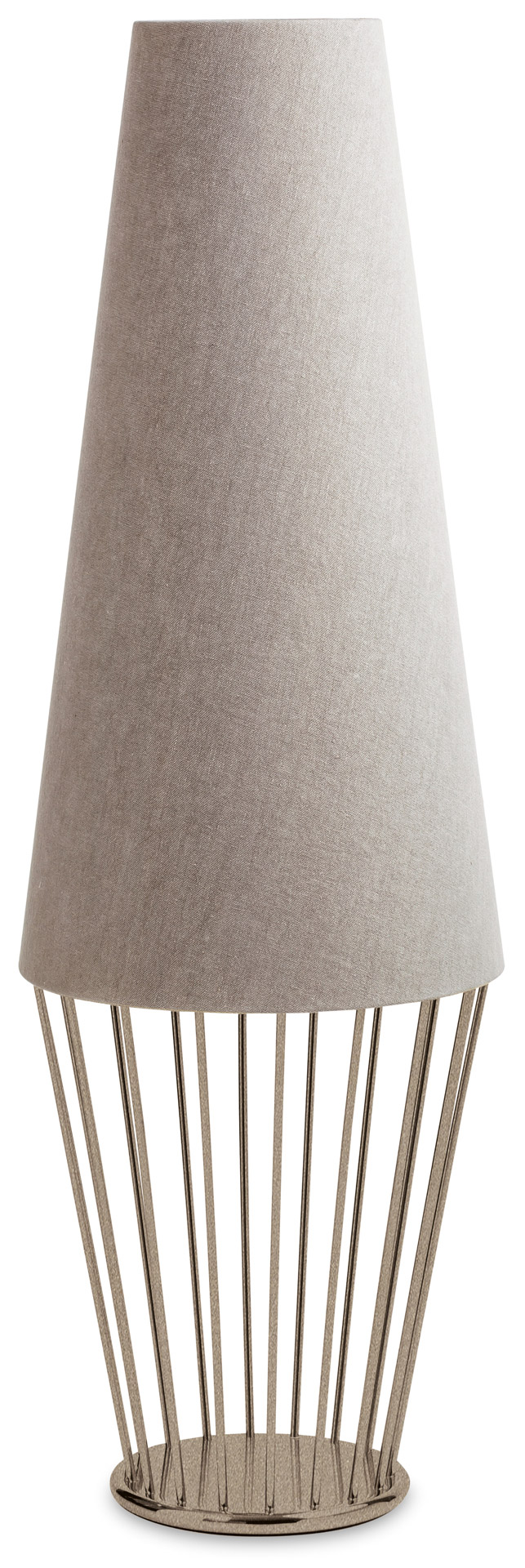La struttura a gabbia è realizzata in tondino di acciaio e fusione di ottone, con saldature a filo e ottone, e finitura in galvanica oro, rame, nichel nero o ferro metallizzato. Il paralume a tronco di cono è in cotone o lino accoppiato. Una lampada da terra dal design moderno ma adatta ad ogni stile, perfetta in una sala anche in composizioni realizzate con lampade Sofia di diverse dimensioni.