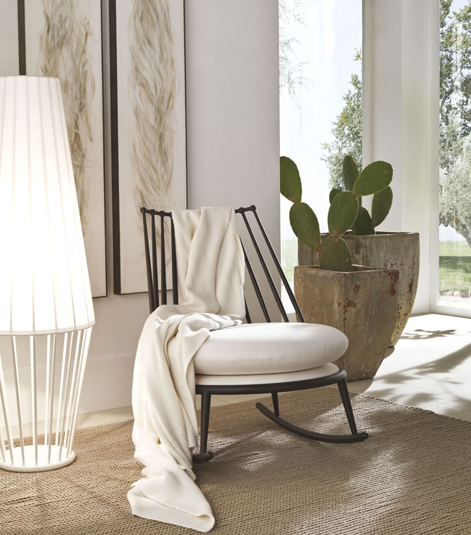 Poltrona a dondolo moderna di design Aurora bacchettata con struttura in ferro con montaggio a tiraggio interno.