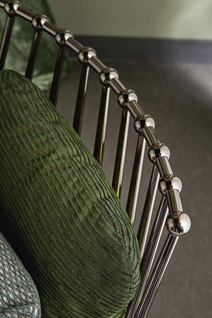 La base è disponibile in diverse finiture dal bagno oro, ottone al ferro metallizzato. La seduta, in legno sagomato e imbottito in gomma a due densità, e i cuscini, sono rivestiti sartorialmente; anche con tessuto o pelle fornita dal cliente. Una poltrona dal sapore vintage dal design internazionale.