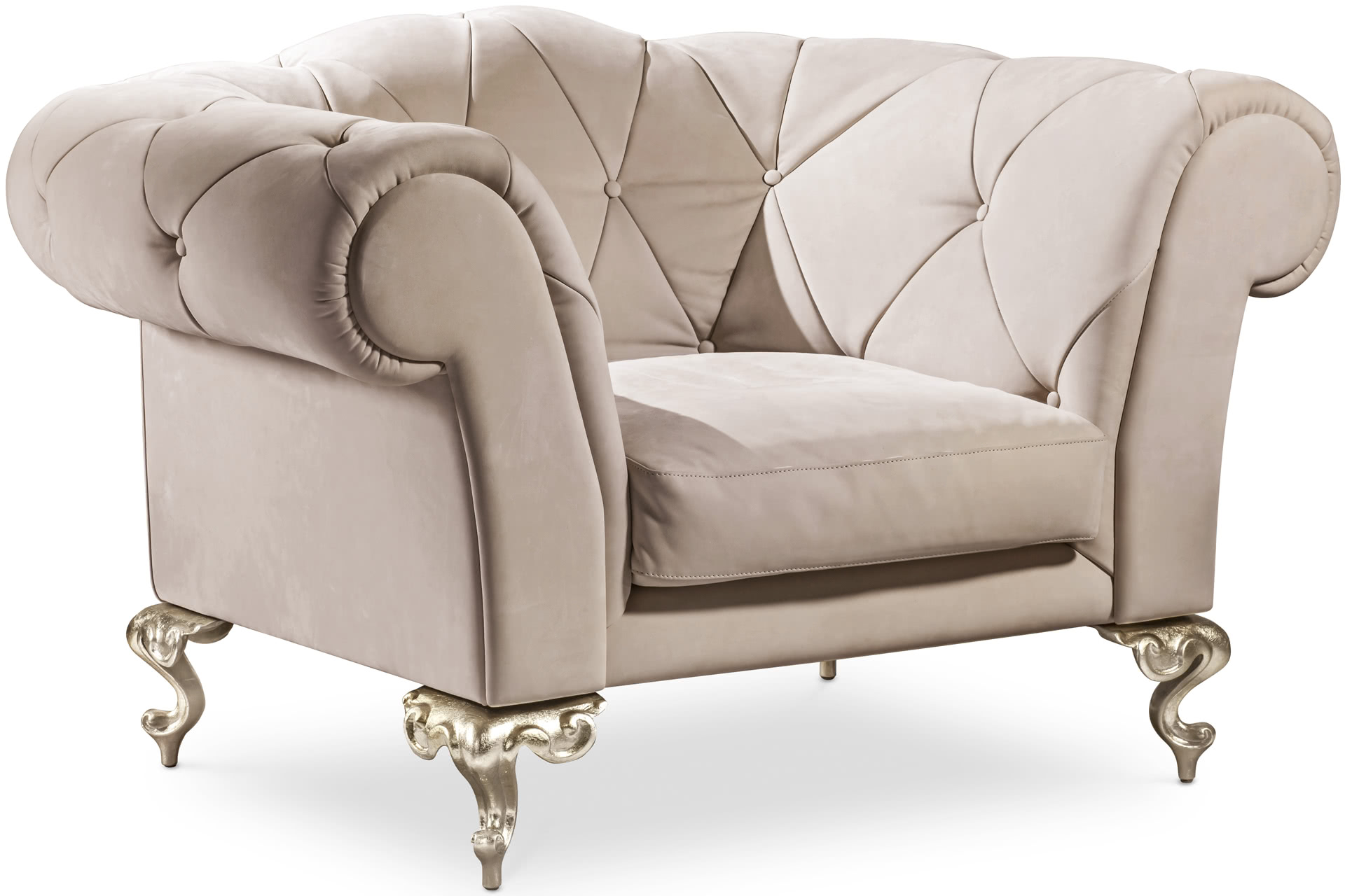 La struttura interna, in legno, è imbottita e rivestita anche con tessuto o pelle forniti dal cliente (non sfoderabile). La lavorazione a capitonné è realizzata fin da dietro la curvatura dello schienale. Il cuscino della seduta è sfoderabile. I piedi, in alluminio pressofuso, sono levigati e decorati a mano in foglia argento, oro o champagne. Una poltrona dallo stile intramontabile, perfetta come centro stanza.