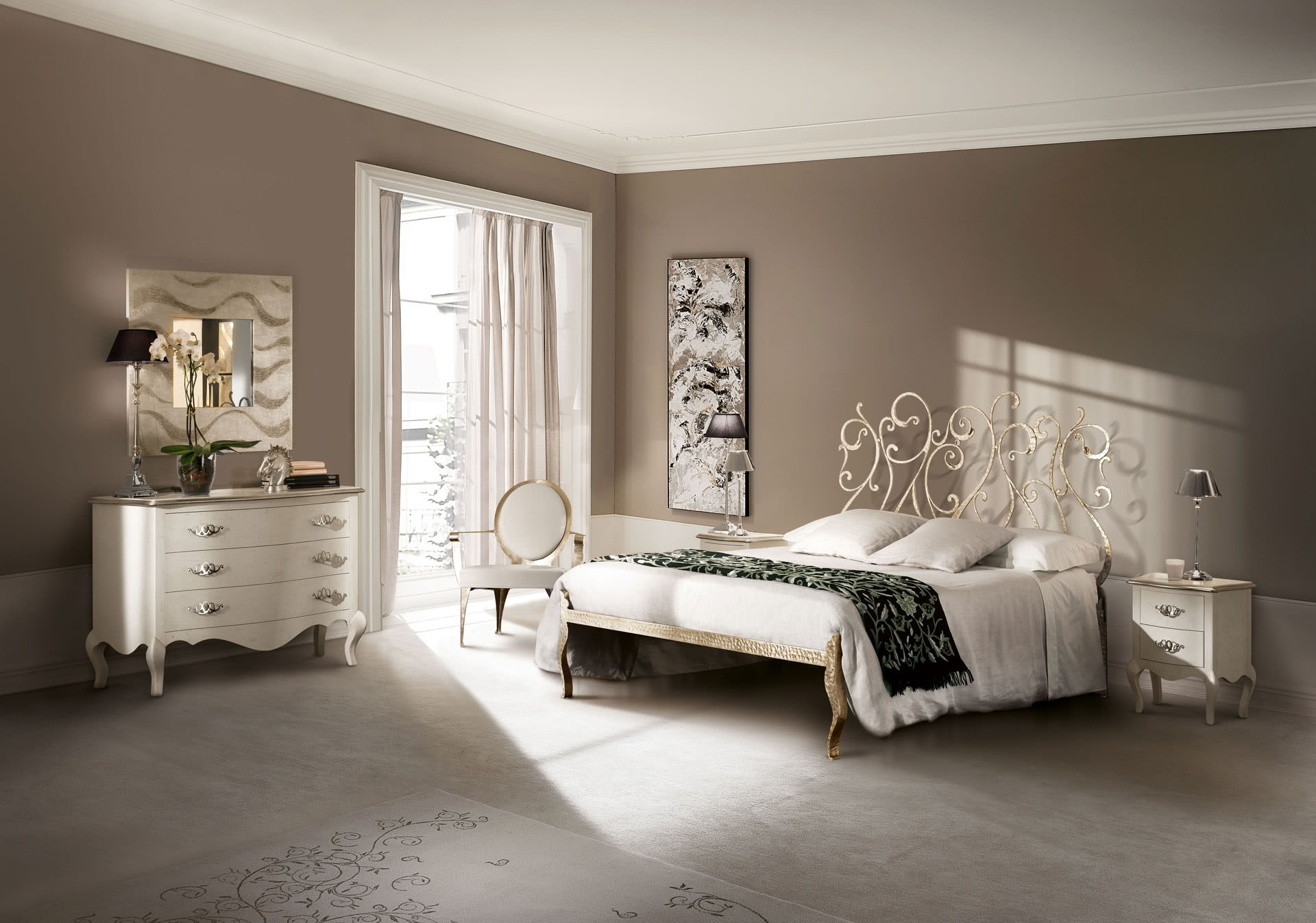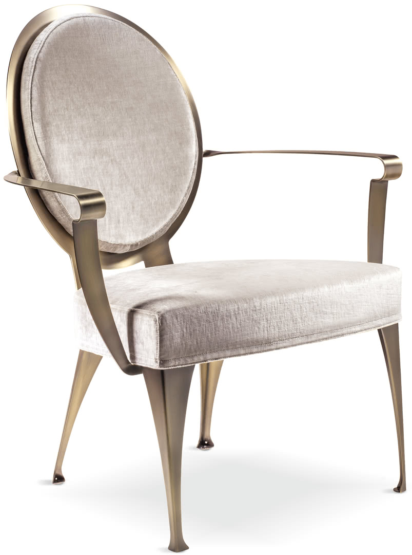 La struttura è in ferro pieno tagliato a laser, curvato, levigato e lucidato a mano, con saldature a filo e a bagno di fusione. La finitura della base è realizzabile anche a bagno di galvanica in oro, ottone, bronzo, nichel nero, rame o in ferro metallizzato. La seduta e la spalliera, in legno sagomato imbottito in gomma, sono rivestite in tessuto, pelle o con un tessuto fornito dal cliente (sfoderabile). Uno stile semplice e lineare per una reinterpretazione in chiave moderna di un grande classico del design.