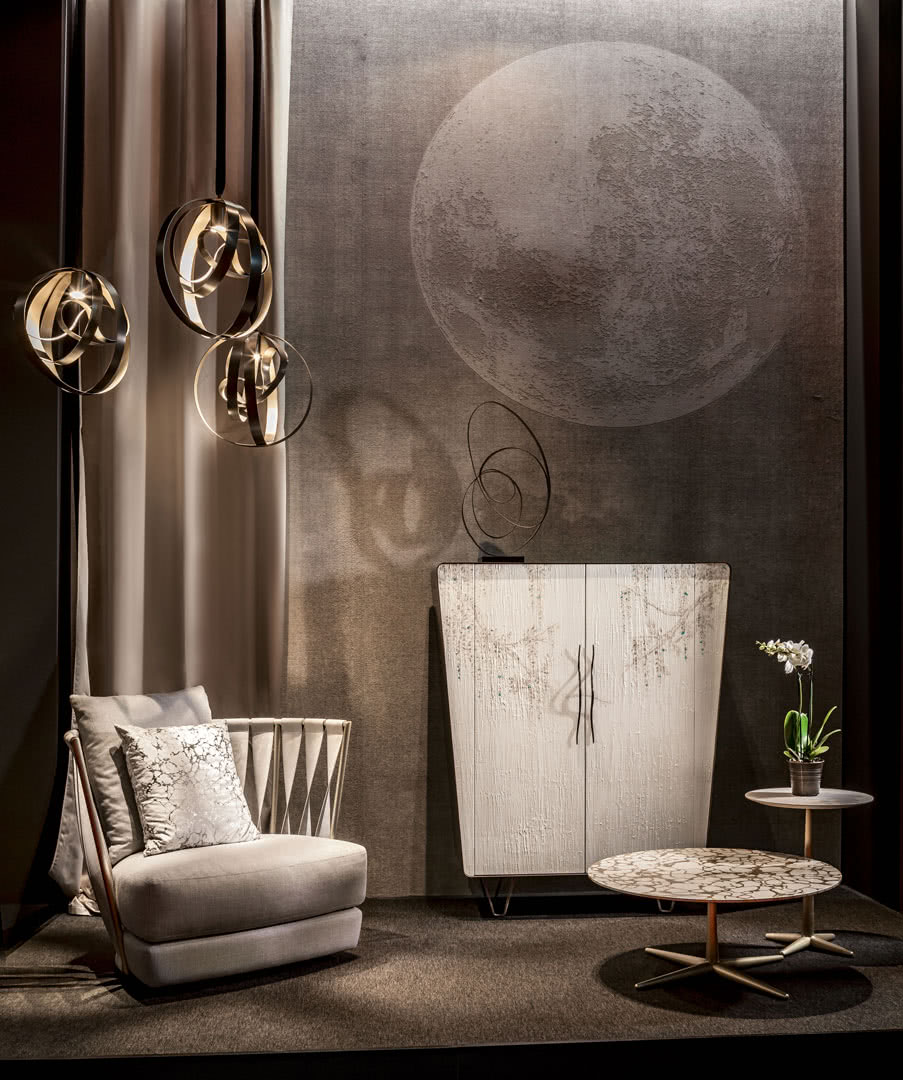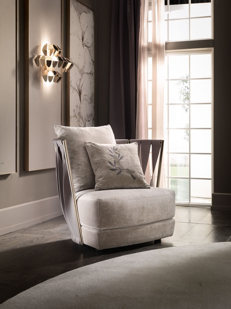La struttura, in ferro curvato, sagomato e saldato a filo, è disponibile in finitura a bagno di galvanica in oro, ottone, nichel nero o rame. La spalliera è costituita da fasce ritorte cucite a mano e con la caratteristica impuntura a vista, realizzabili in pelle, ecopelle, nabuk o econabuk. La seduta, in legno multistrato di pioppo pantografato, è imbottito in gomma, con strato superiore in piume, ed rivestito sartorialmente in tessuto, velluto, pelle o con un tessuto fornito dal cliente. I cuscini decorativi sono imbottiti con piume.