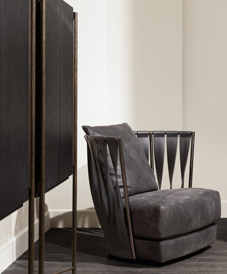 Poltrona moderna di design Twist con schienale a fasce in pelle o ecopelle.