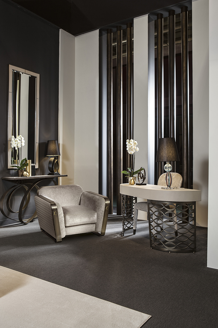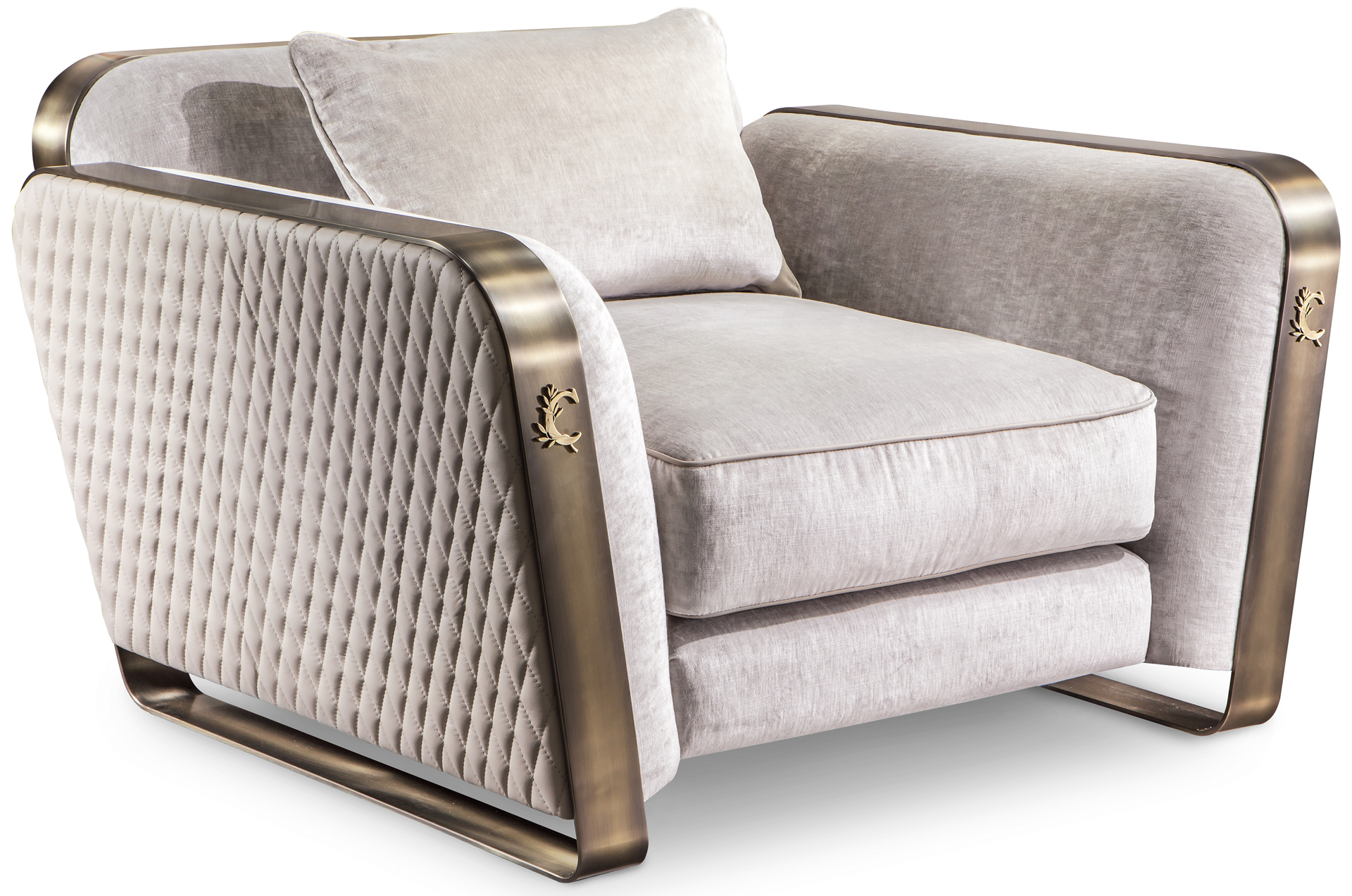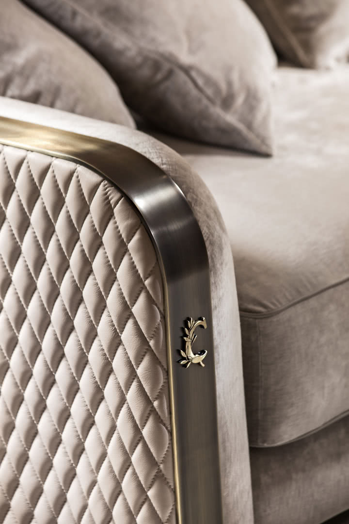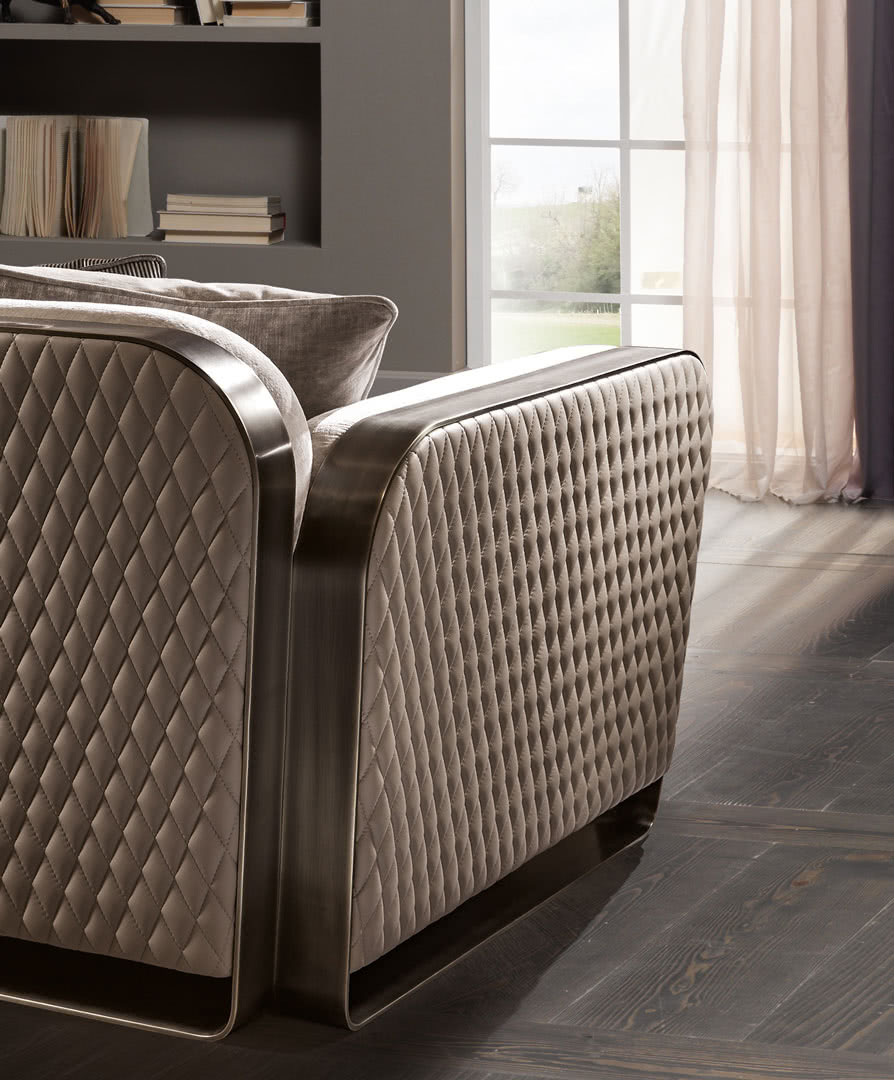 La base è in bronzo realizzata con la decorazione classica Cantori. La morbidezza dei rivestimenti e l’esterno trapuntato, realizzabili anche con un tessuto fornito dal cliente, si contrappongono alle fasce in bronzo dei braccioli laterali che, intersecandosi sul retro, creano un forte segno grafico. Una poltrona con un’ambivalenza di stili: si adatta ad un ambiente moderno, e si integra perfettamente in uno classico. Un comfort completo grazie alle due misure disponibili.