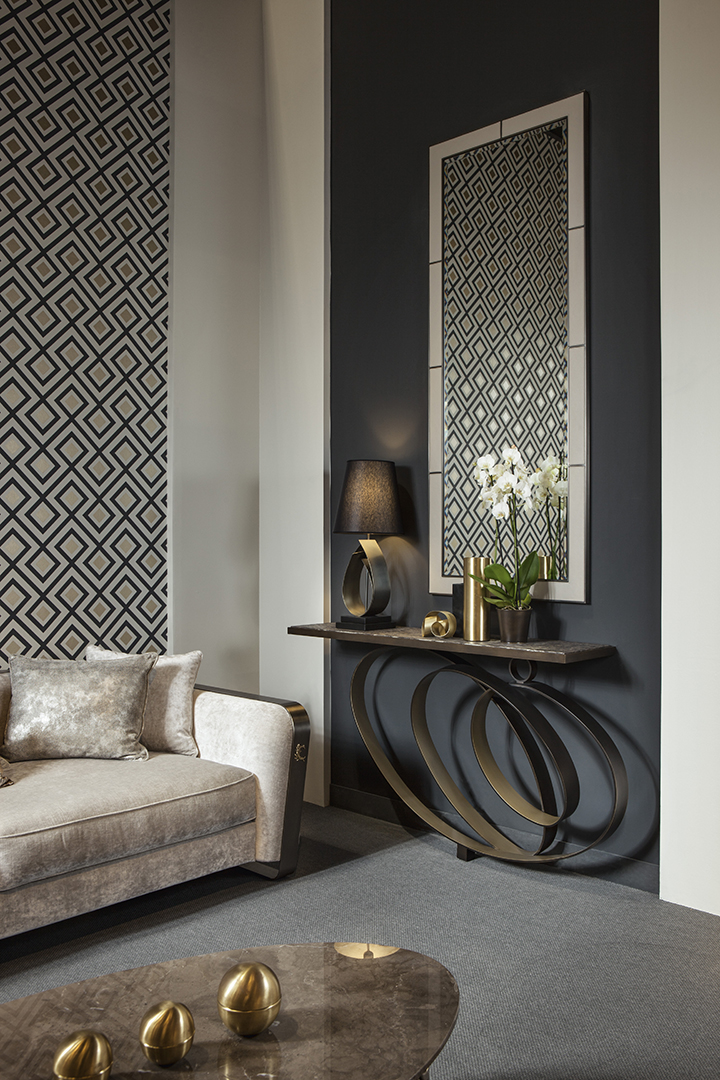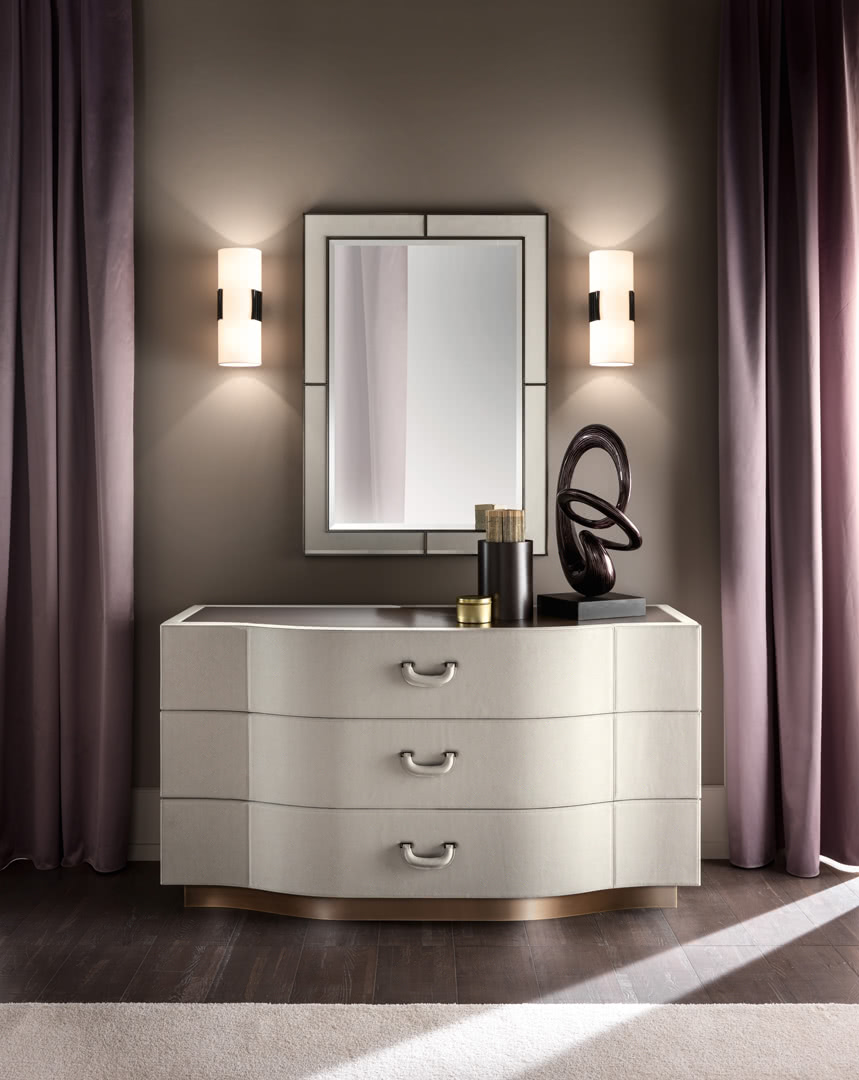 Lo specchio è argentato a doppio fondo. Il telaio, in ferro pieno decorato a mano o in bagno di galvanica bronzo, fa da cornice agli inserti rivestiti in pelle, pelle saffiano o con una pelle fornita dal cliente, e impunturati. La specchiera Amelia è disponibile in due diverse dimensioni e con possibilità di aggancio a parete orizzontale e verticale.