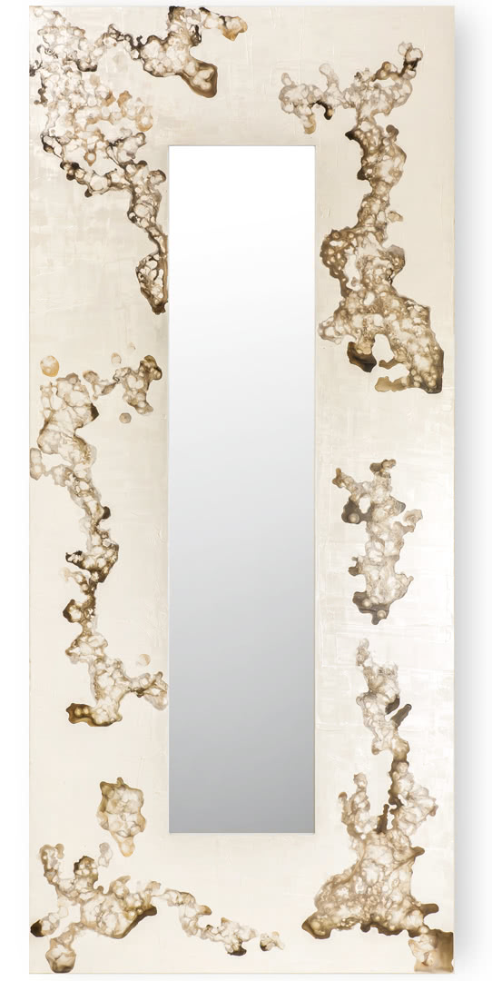 Lo specchio è argentato a doppio fondo con una cornice formata da un'unica lastra di legno, non assemblata, con finestra centrale pantografata. La decorazione artistica è realizzata interamente a mano. La specchiera è disponibile nella versione rettangolare (con possibilità di aggancio sia in orizzontale che verticale), quadrata, rotonda e in varie misure; perfetta per l'ingresso, la sala o la camera da letto.