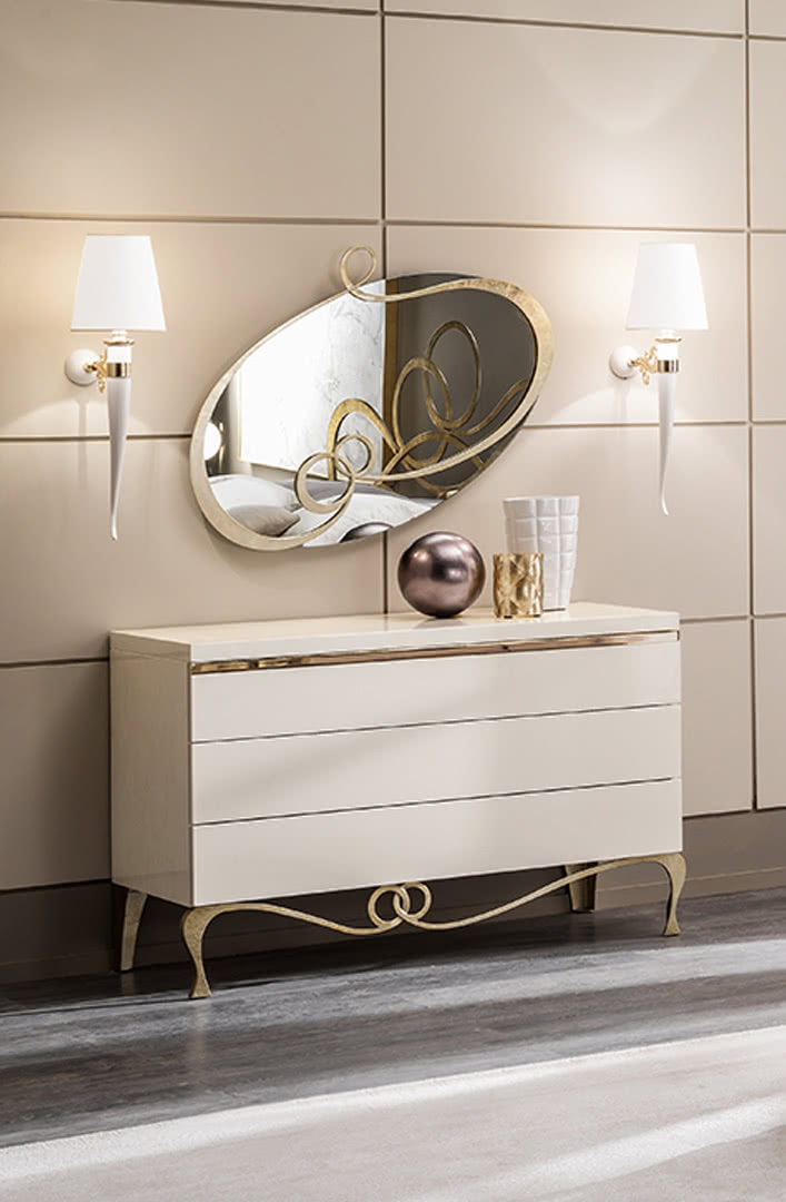 Lo specchio è argentato a doppio fondo e molato; i particolari sono tagliati a laser e bombati a freddo, con levigatura e decorazione artigianale in foglia. Il sistema di aggancio è regolabile, per consentire di appendere la specchiera con l’inclinazione che si desidera.