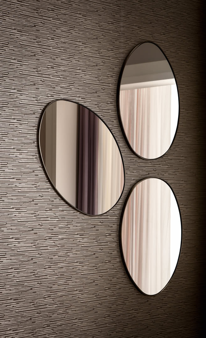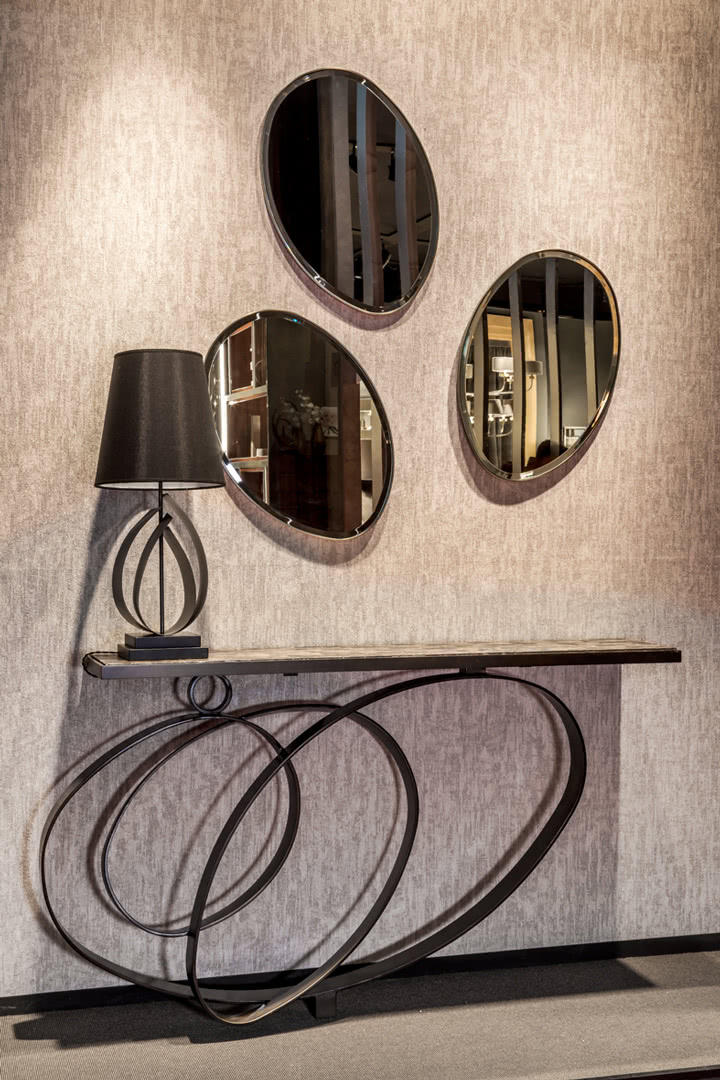 Lo specchio è in vetro molato con forma irregolare e cornice in ferro piatto. La forma sinuosa di questa specchiera permette di creare diverse composizioni sulla parete della sala o dell'ingresso.