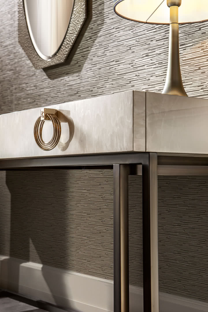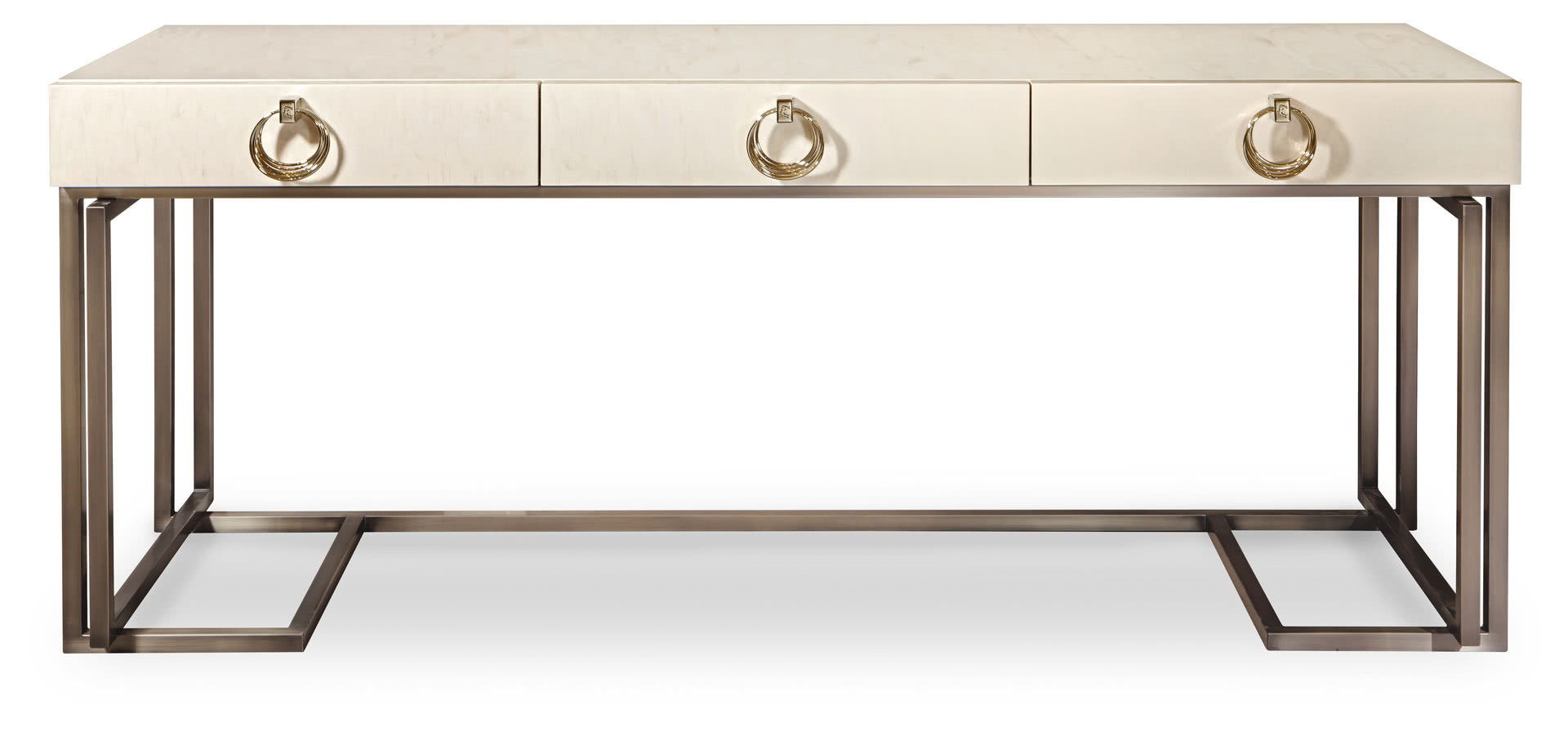 Base in brushed bronze finishing. The jewel-like handles in pale gold finishing are entirely handmade. Their shape draws inspiration from the doorknockers and bangle bracelets. The console-table, with brushed finishing applied on a bronzed coat, is enriched by these elements. The handles, in fact, soften its squared lines and its rigourous design.