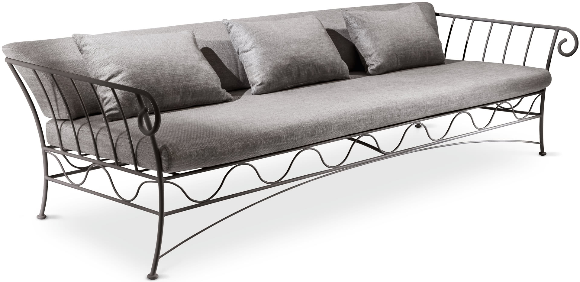 La struttura è in ferro antracite curvato, rastremato e battuto a caldo, con saldature a filo e levigatura realizzata a mano. I cuscini della seduta e della spalliera sono in tessuto e completamente sfoderabili. Perfetto per creare zone living confortevoli anche in veranda o a bordo piscina come divano da esterno, dato il design versatile e il trattamento di tropicalizzazione del metallo.