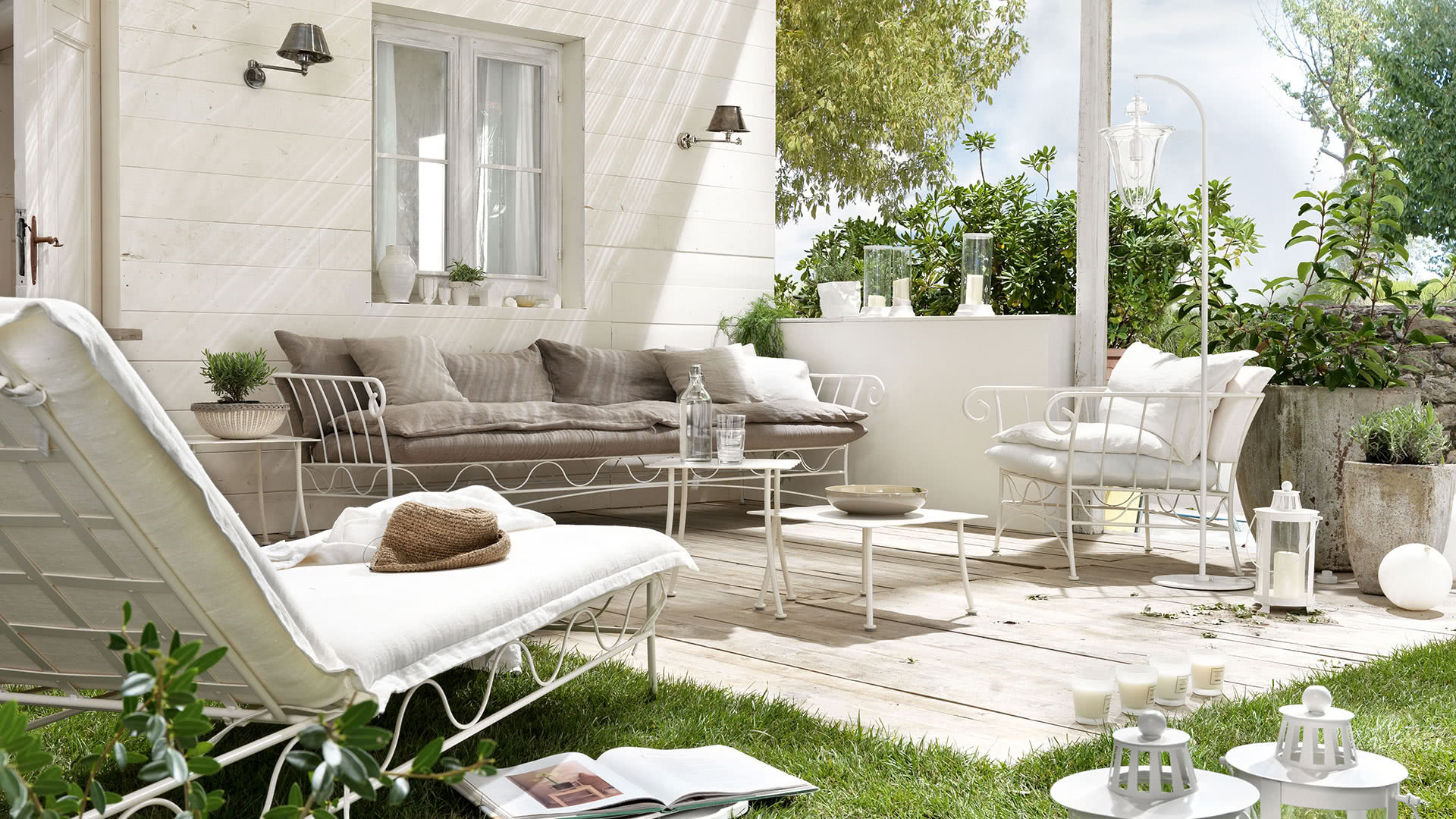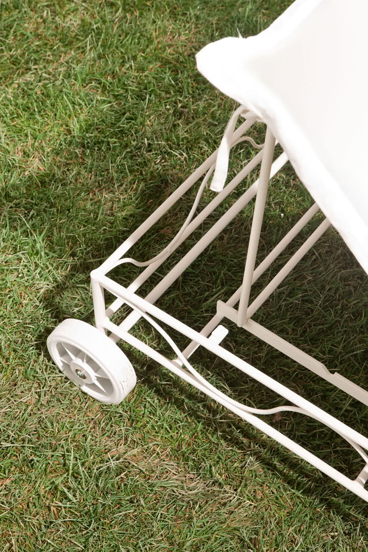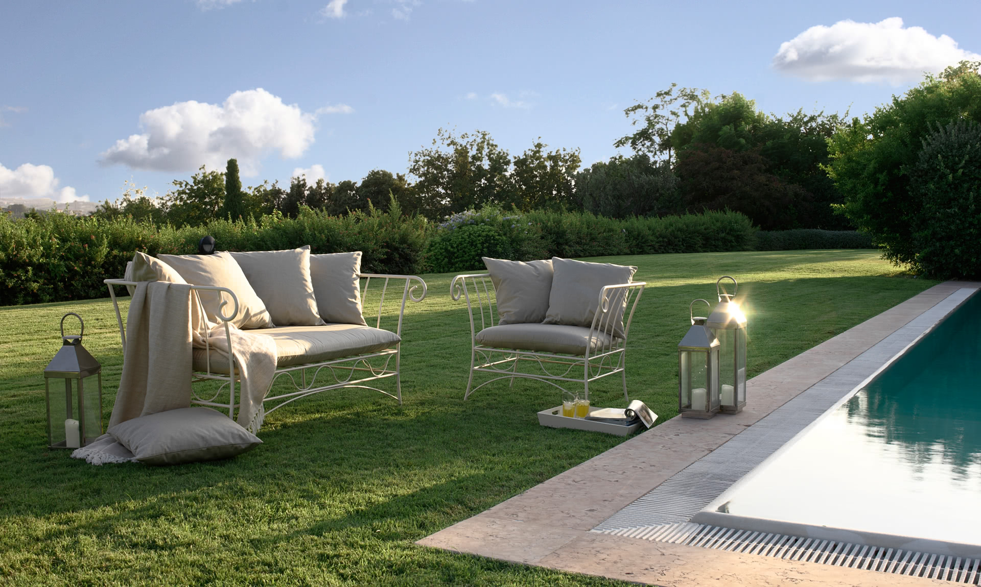 La struttura è in ferro antracite, curvato, rastremato e battuto a caldo, con saldature a filo e levigatura realizzate a mano. Il set di cuscini per la seduta e la spalliera sono completamente sfoderabili.